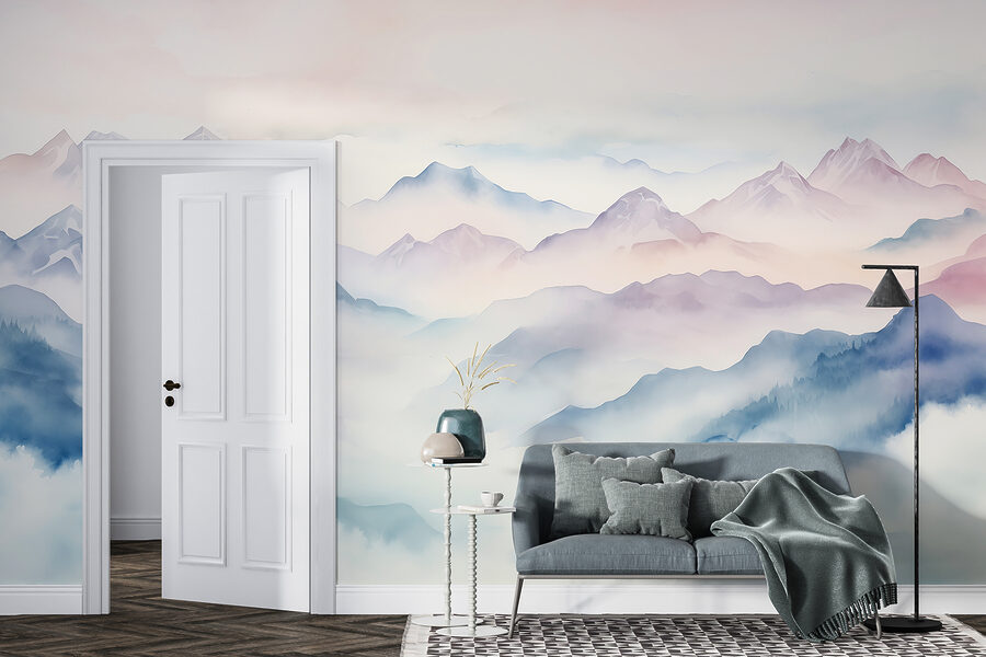 Aduceți marea natură în interior cu această pictură murală încântătoare, “Pictură de munți și nori”. Este ca și cum ai păși într-un vis în acuarelă – nuanțe moi de albastru și violet se transformă în vârfuri de munte cețoase. Acei nori par suficient de pufoși pentru a pluti pe ei, nu-i așa? Imaginează-ți că ajungi acasă după o zi lungă, te afunzi în fotoliul tău preferat și simți că privești un peisaj nesfârșit. Perfect pentru acel loc din casa ta care are nevoie de puțină magie. Cine are nevoie de o priveliște de la fereastră când ai această frumusețe?