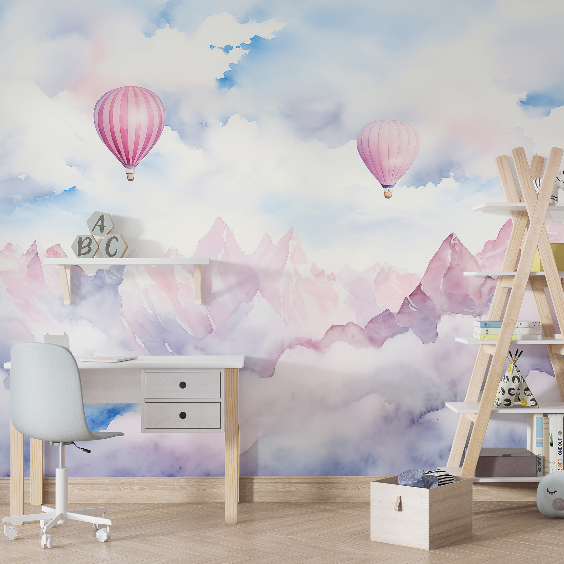 Imaginați-vă că vă treziți și vă sorbiți cafeaua de dimineață în timp ce câteva baloane cu aer cald plutesc visător pe peretele dumneavoastră. Nuanțele bogate de acuarelă surprind vibrația ușoară și aerisită a unei zile perfecte deasupra norilor. Această pictură murală nu este doar decor – este ca și cum ai avea o fereastră către o lume încântătoare și senină. Are acea senzație magică, de hoinăreală, fără a ieși din casă. Perfectă pentru visători și aventurieri deopotrivă! Un strop de măreție montană și cer blând… este ca o îmbrățișare proprie a naturii pentru pereții dvs.