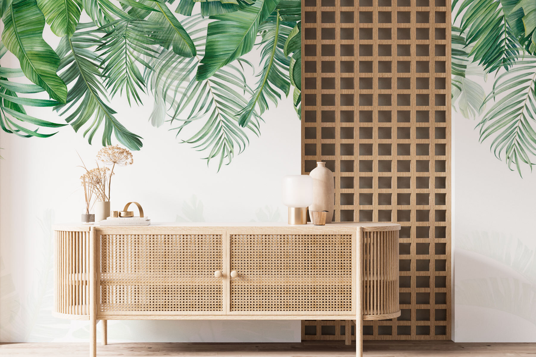 Transformați-vă spațiul într-un paradis tropical cu pictura murală “Rând de frunze verzi”. Imaginați-vă că pășiți într-o junglă luminată de soare de fiecare dată când intrați în cameră – ce plăcere! Vegetația luxuriantă aduce un vibe răcoritor, făcând-o să se simtă vie și primitoare. Perfect pentru serile confortabile cu prietenii sau doar pentru a vă bucura de frumusețea sa în timp ce sorbiți o cafea.