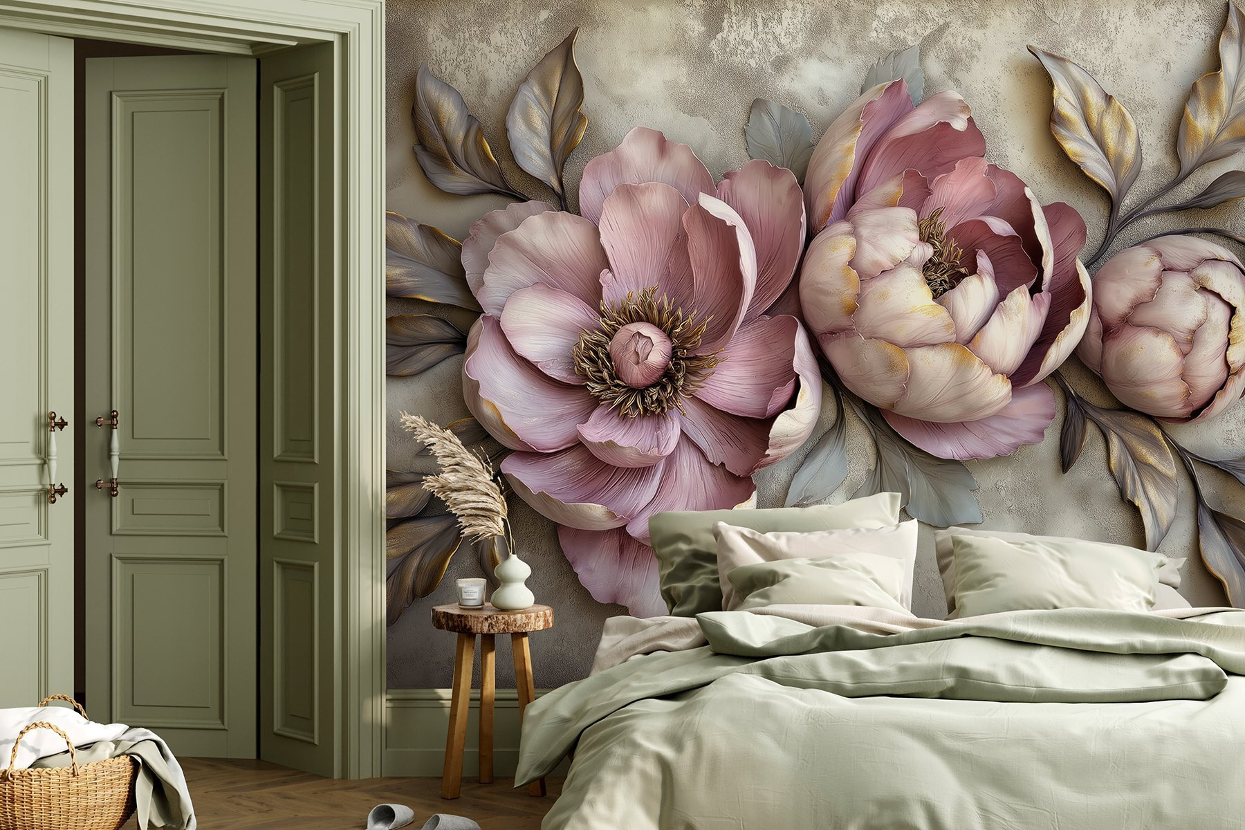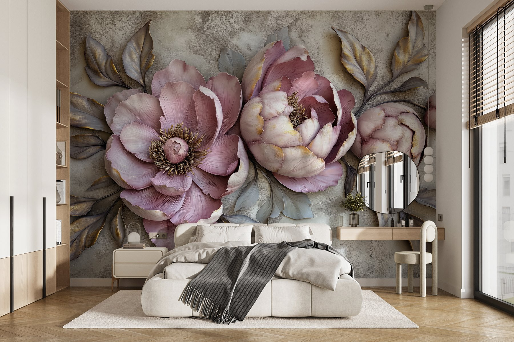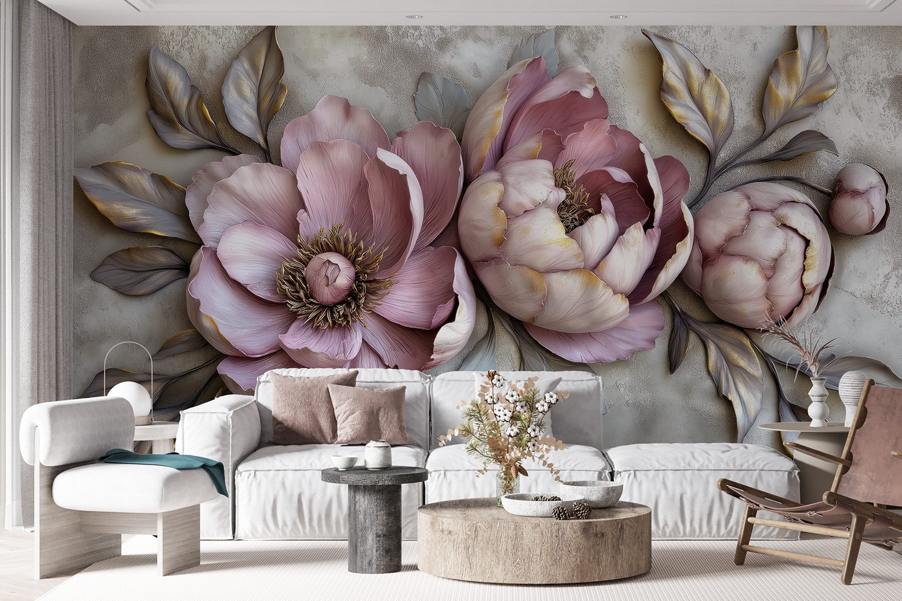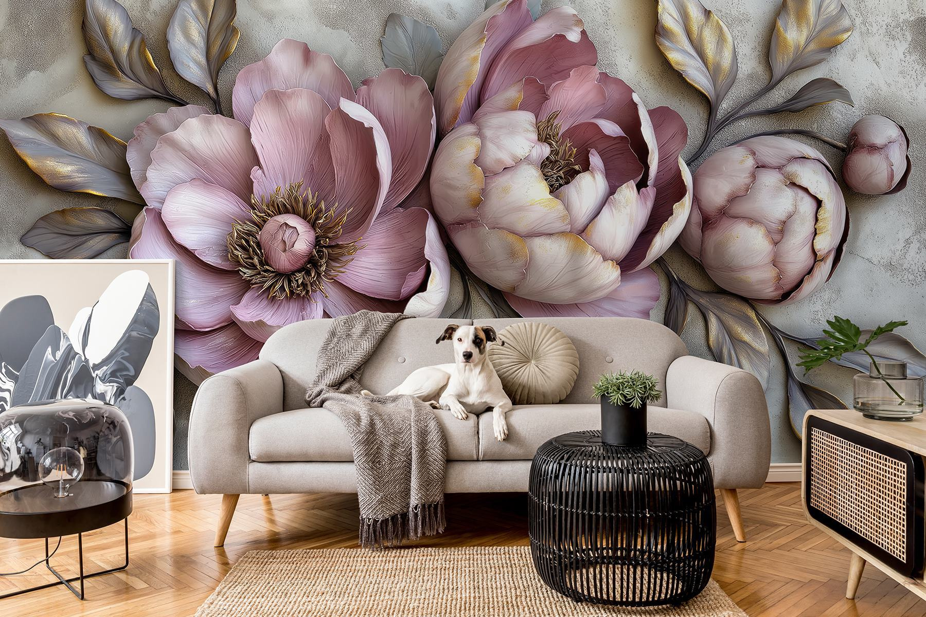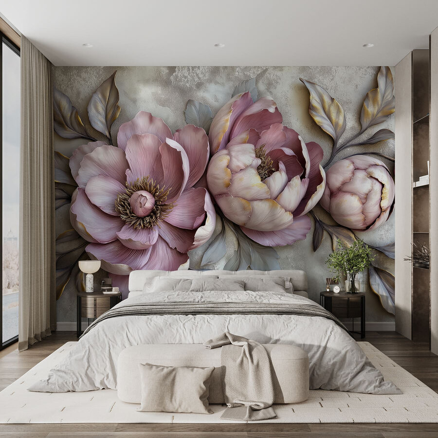 Transformați orice cameră cu această pictură murală uimitoare, cu o tapiserie frumoasă de flori și frunze care practic sar de pe perete. Imaginați-vă că pășiți în spațiul dvs. și sunteți imediat înconjurat de căldura și farmecul naturii. Aceste bujori par gata să înflorească chiar în camera dvs. de zi! Culorile pastelate moi creează un fundal încântător, făcându-l perfect pentru serile confortabile sau pentru zilele luminoase și însorite. În plus, este o sursă de conversație – cine nu ar fi curios de aceste flori superbe? Oferiți pereților dvs. o personalitate care aduce bucurie și o notă de eleganță. Perfect pentru iubitorii de flori!