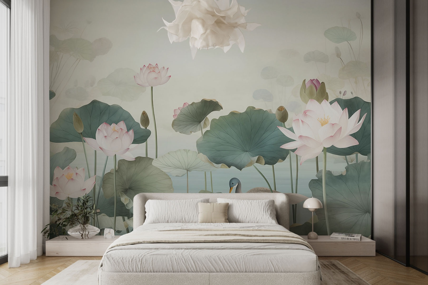 Transformați orice spațiu într-o oază liniștită cu această pictură murală încântătoare a unei rațe care vâslește grațios printr-un iaz senin împodobit cu frumoase flori de lotus. Efectul moale de acuarelă aduce un vibe de vis, perfect pentru un colț de lectură confortabil sau un dormitor liniștit. Imaginați-vă învăluindu-vă în culorile liniștitoare în timp ce sorbiți ceai sau visați cu ochii deschiși la locuri îndepărtate. Este ca și cum ai aduce o șoaptă de natură în interior, fără toate insectele enervante! Această pictură murală nu este doar decor; este o bucățică de liniște care evocă un suspin ușor de fiecare dată când treceți pe lângă ea.