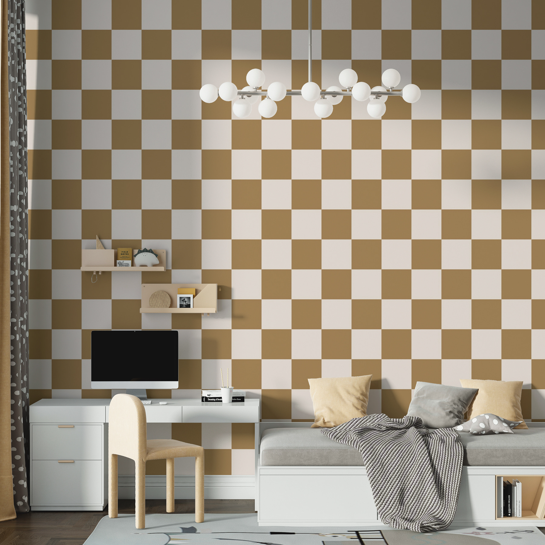 Imaginați-vă că pășiți într-o cameră care seamănă cu o cafenea confortabilă, datorită acestei picturi murale încântătoare în carouri maro și albe. Are acea atmosferă clasică de tablă de șah care stârnește nostalgie – gândiți-vă la serile de jocuri sau la bucătăria bunicii. Fiecare pătrat pare să vă invite să vă așezați, să vă relaxați și poate să sorbiți o băutură caldă în timp ce discutați despre orice și despre nimic. Tonurile blânde, pământii fundamentează spațiul, făcându-l să se simtă atât primitor, cât și elegant. Perfecte pentru un perete statement sau pentru a completa o colecție de piese de artă excentrice. Este ca și cum ai purta puloverul tău preferat – familiar, reconfortant și puțin șic!