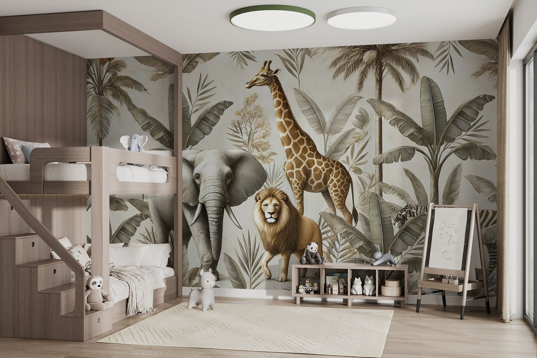 Transformați-vă spațiul într-o evadare exotică cu această pictură murală uimitoare care prezintă o scenă de junglă plină de viață. Imaginați-vă un elefant îndrăzneț, o girafă regală și un leu maiestuos, toate în mijlocul plantelor luxuriante și palmierilor – cum ar putea o cameră să nu se simtă mai aventuroasă? Este ca și cum ai aduce o felie din sălbăticie chiar în casa ta. Familiei și prietenilor le va plăcea să vorbească despre tigrul fioros care se ascunde în verdeață în timp ce își sorb cafeaua. În plus, tonurile calde, pământii creează o atmosferă liniștitoare, perfectă pentru relaxare sau inspirație. Această pictură murală nu este doar decor; este o mică aventură care așteaptă să se întâmple!
