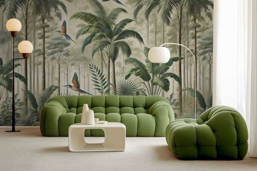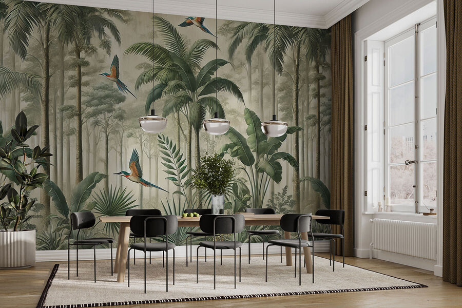 Transformați orice cameră într-o evadare liniștită cu această pictură murală uimitoare cu păsări înălțându-se deasupra unei păduri luxuriante. Imaginați-vă că pășiți înăuntru și vă simțiți ca într-o junglă senină, unde culorile vibrante ies în evidență, iar aerul este îmbibat cu parfumul frunzelor tropicale. Zborul jucăuș al păsărilor adaugă o notă de fantezie, înveselind chiar și cele mai plictisitoare spații. Perfectă pentru crearea unui colț de lectură confortabil sau a unui refugiu liniștit, această pictură murală șoptește blând despre aventură și calm. Ideală pentru oricine iubește natura sau are nevoie de o mică evadare din agitația cotidiană – pentru că cine nu vrea să se simtă ca într-o escapadă tropicală? Așadar, lăsați-vă pereții să cânte și să vă înveselească spațiul!