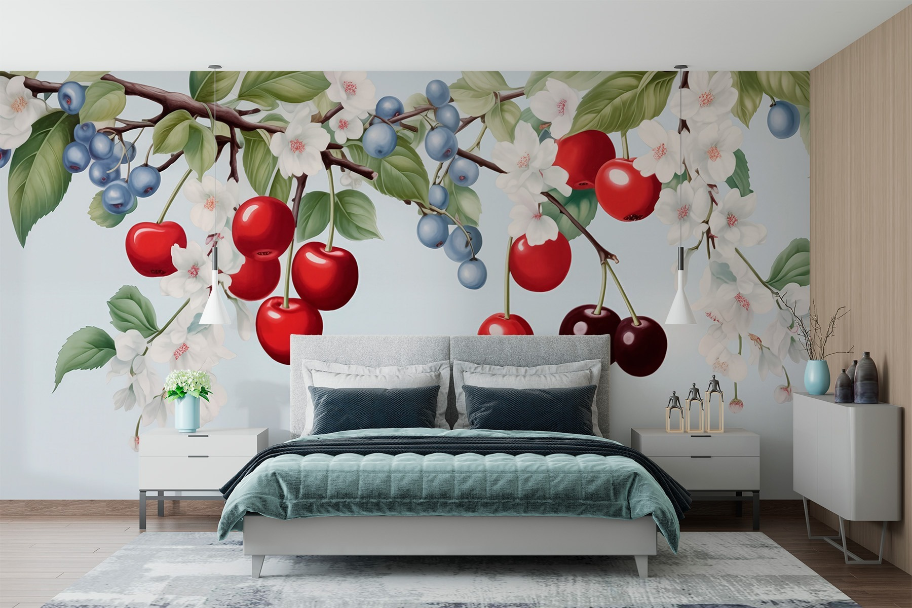 Primiți o felie de natură în spațiul dvs. cu această pictură murală uimitoare cu cireșe și afine pe o ramură. Este ca și cum ai invita o livadă întreagă înăuntru – fără albine și degete lipicioase! Roșul vibrant și albastrul blând ies în evidență pe un fundal liniștitor, creând o atmosferă senină, perfectă pentru un dormitor sau o cameră de zi. Imaginați-vă sorbind ceai și visând cu ochii deschiși în timp ce priviți aceste fructe luxuriante, sau poate creând un colț de lectură confortabil în care poveștile prind viață, la fel ca aceste flori. Această pictură murală aduce o notă blândă de aer liber, făcând fiecare zi să pară puțin mai magică. Pereții dvs. merită acest tratament!