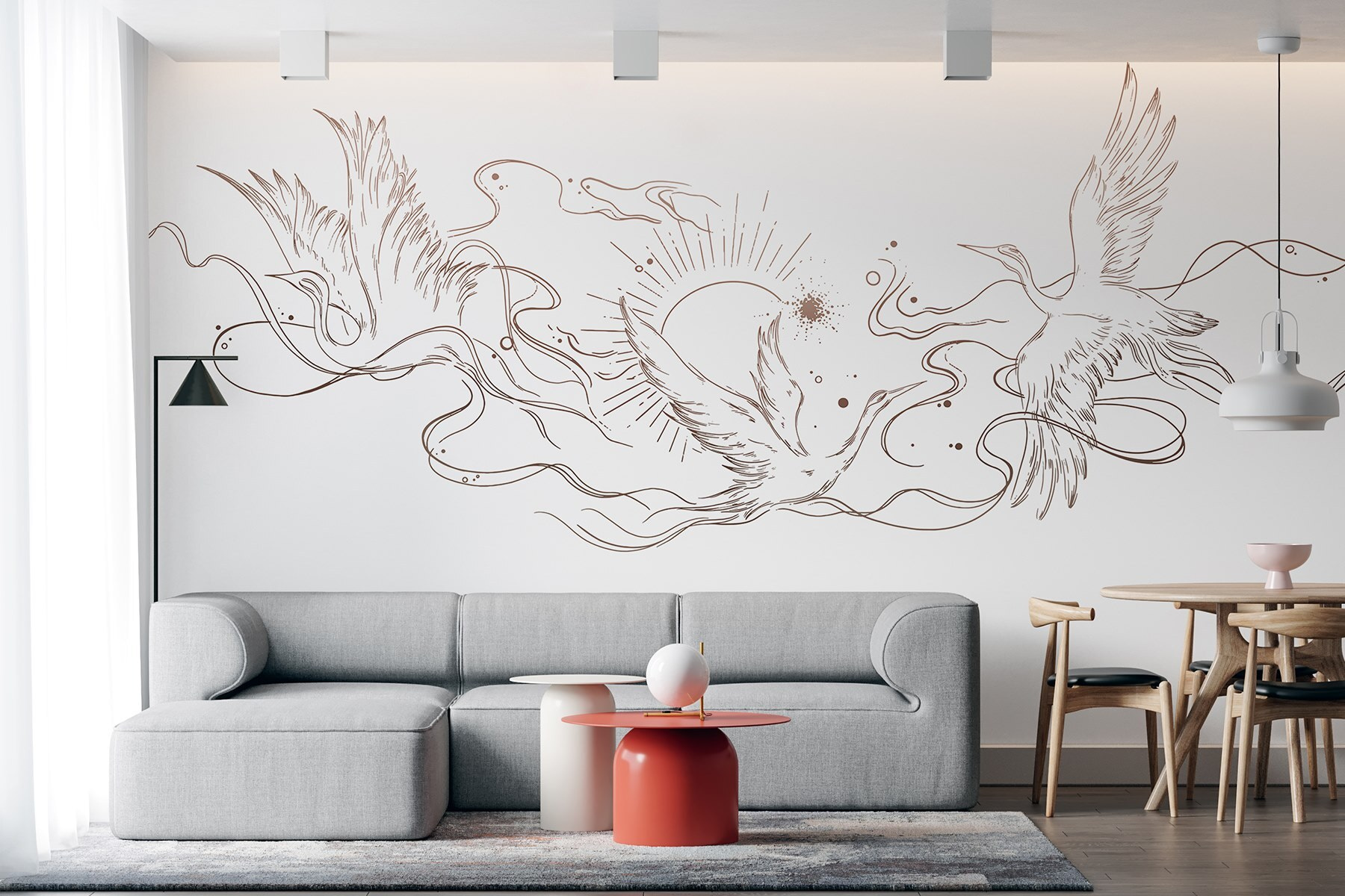 Transformați-vă pereții într-o evadare senină cu această pictură murală încântătoare cu păsări care dansează în lumina soarelui. Liniile blânde și nuanțele subtile insuflă viață în orice spațiu, făcându-l să se simtă confortabil și primitor. Imaginați-vă că vă treziți la această scenă veselă; este ca și cum ați avea o mică bucată de natură chiar acasă. Perfectă pentru o cameră de zi sau chiar pentru o cameră de copil de vis, aceasta vă învăluie camera în căldură și fantezie. Prietenii vor crede că aveți o atmosferă de galerie de artă – poate că asta înseamnă că o seară de vin este în ordine, nu? Adăugați această pictură murală și lăsați pereții să spună o poveste despre bucurie și libertate.