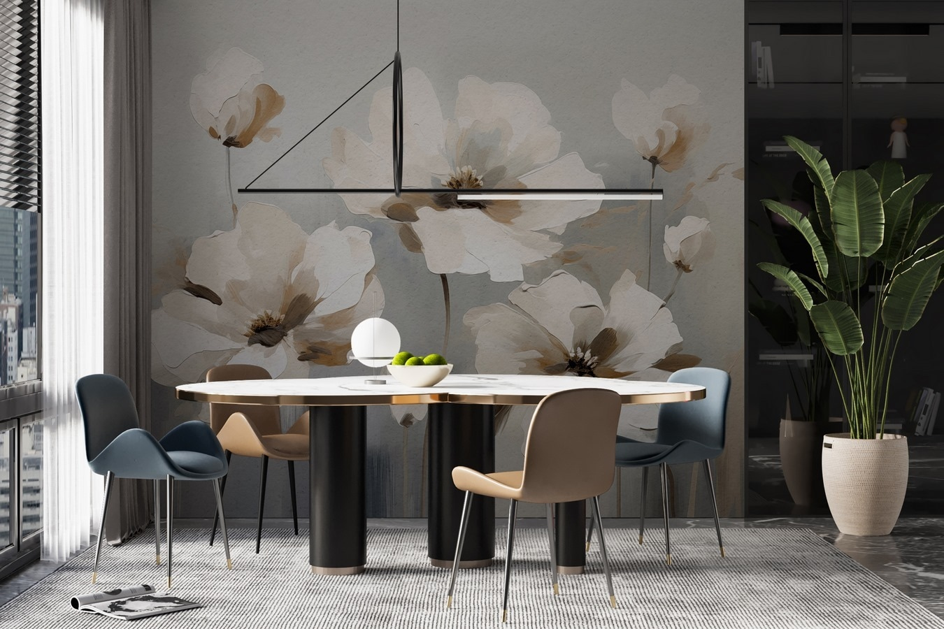 Imaginați-vă că intrați într-o cameră care se simte ca o îmbrățișare blândă – datorită acestei superbe picturi murale de flori albe. Este ca o șoaptă blândă a naturii care vă invită înăuntru. Efectul de acuarelă îi conferă o vibrație de vis, perfectă pentru a crea o oază de seninătate acasă. Imaginați-vă sorbindu-vă cafeaua de dimineață în timp ce aceste flori vă luminează spațiul. Ele par să danseze pe pereți, fiecare petală spunând o poveste despre calm și grație. Fie că este vorba de un colț confortabil sau de un living însorit, acest mural aduce căldură și un strop de eleganță. Cine ar fi crezut că florile pot fi atât de sofisticate, dar în același timp răcoroase? Perfect pentru cei care apreciază frumusețea în simplitate!