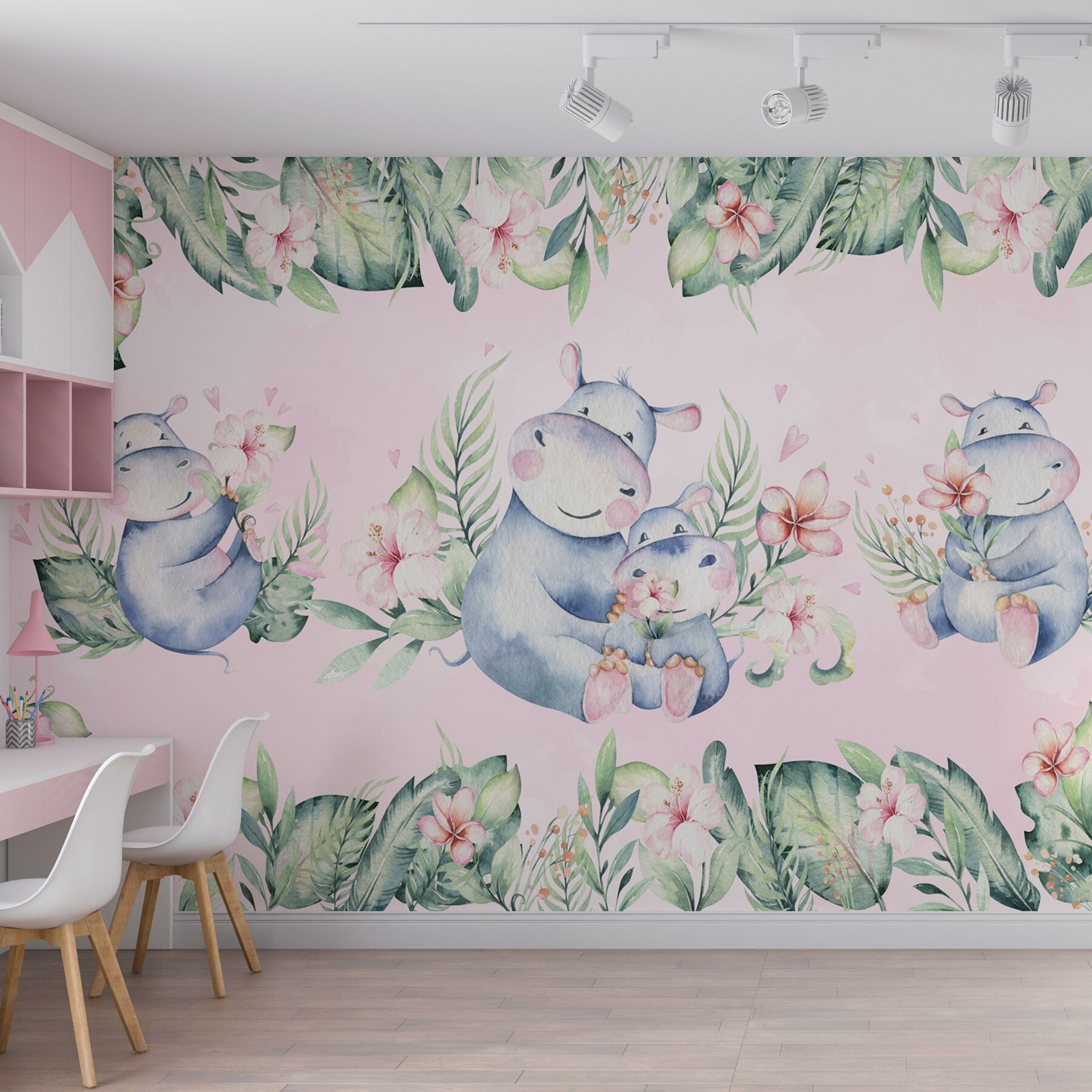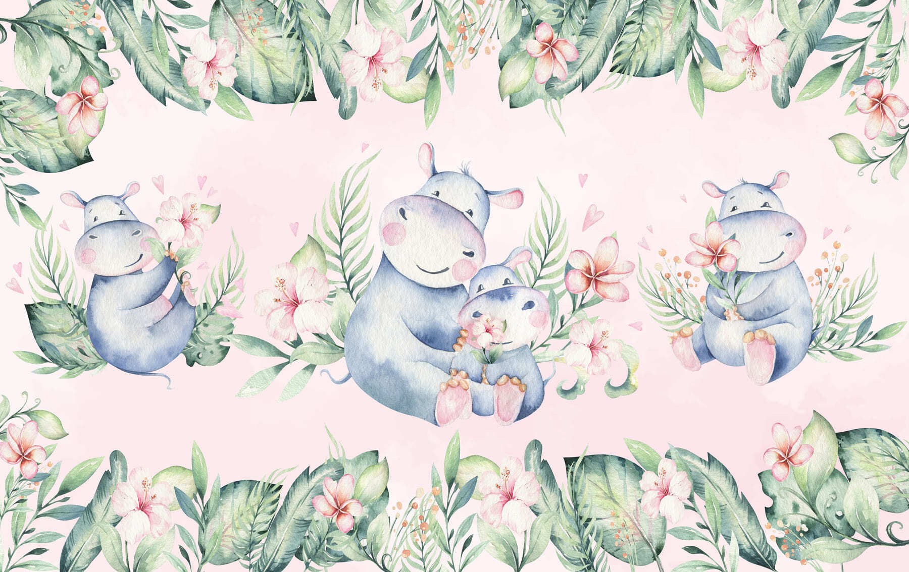 Transformați-vă spațiul cu această pictură murală încântătoare care prezintă hippopotami fermecători în acuarelă, cuibăriți printre flori vibrante. Imaginați-vă intrând într-o cameră în care aceste creaturi adorabile par să chicotească și să îmbrățișeze frumusețea naturii, înveselindu-vă instantaneu starea de spirit. Perfectă pentru camere de copii sau zone jucăușe, această pictură murală adaugă un vibe vesel care șoptește bucurie. Fundalul roz liniștitor o face să pară caldă și primitoare. Este ca și cum ai avea o bucățică de savană chiar în casa ta, unde fiecare privire aduce un zâmbet – cine nu și-ar dori asta? În plus, ar putea inspira câteva momente amuzante de povestire!