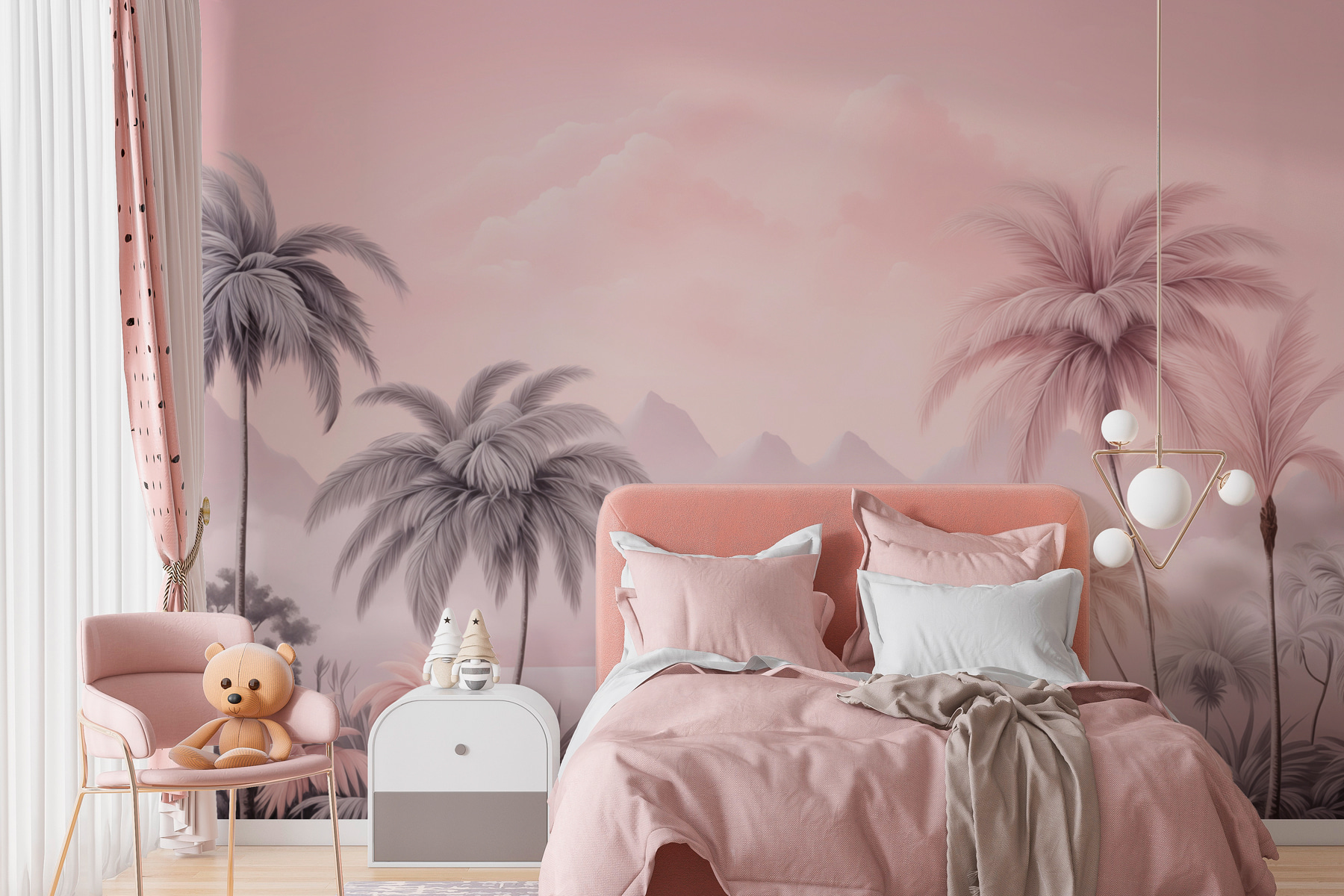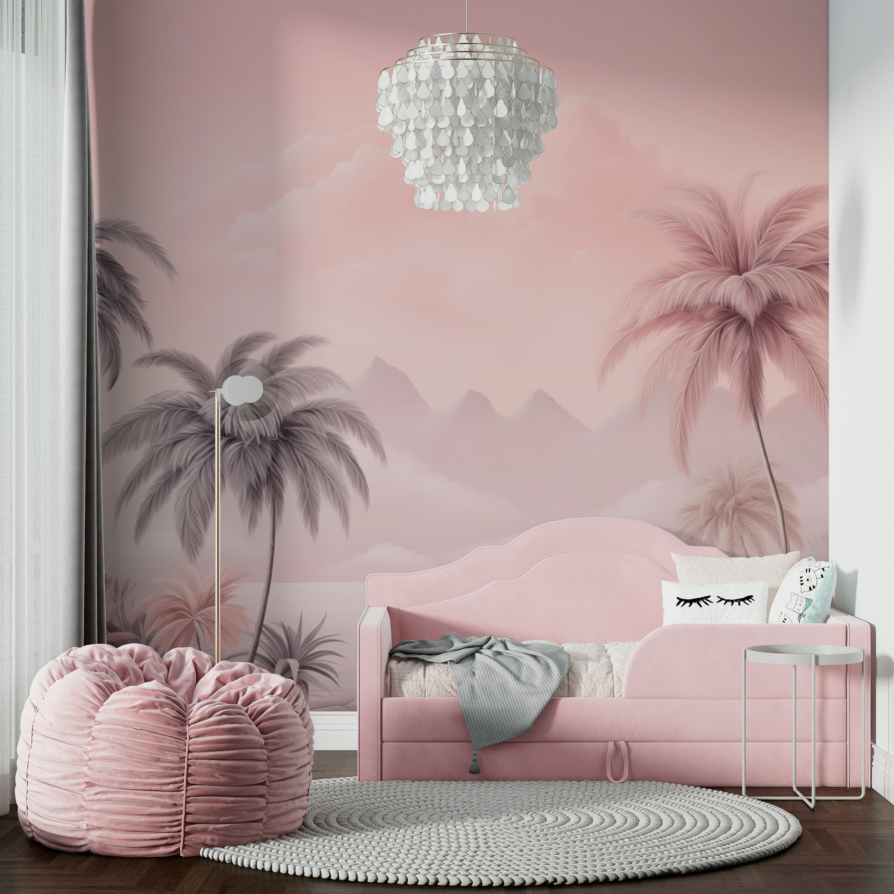 Transformați-vă spațiul într-o escapadă liniștită cu această murală uimitoare cu palmieri luxurianți și munți senini. Imaginați-vă sorbind băutura preferată în timp ce nuanțele blânde de roz și gri vă învăluie, făcând fiecare zi să se simtă ca o vacanță. Este perfect pentru a crea o atmosferă relaxată – indiferent dacă este în camera de zi sau în colțul de lectură confortabil pe care ți-ai dori să îl ai! Modul în care munții se zăresc printre palmieri? Magie pură. Este ca și cum natura ar fi adusă în interior, liniștindu-ți sufletul cu fiecare privire în parte. În plus, este suficient de îndrăzneț pentru a iniția o conversație – cine nu ar admira asta?