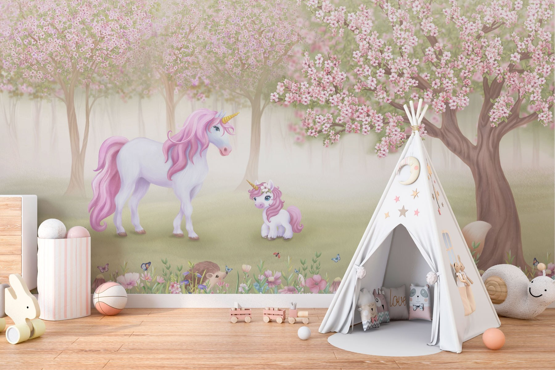 Transformați orice cameră într-o țară a minunilor capricioasă cu această pictură murală încântătoare care prezintă un unicorn și prietenii săi blănoși. Imaginați-vă florile roz delicate legănându-se ușor, umplând aerul cu dulceață – perfect pentru a stârni bucurie în fiecare zi. Duo-ul unicornilor și al adorabilelor creaturi din pădure invită la o energie blândă, jucăușă, căreia este greu să îi rezistați. Imaginați-vă după-amiezi confortabile petrecute citind sau visând cu ochii deschiși, cu frumusețea naturii la doar o privire distanță. Această pictură murală nu doar decorează – spune o poveste, aducând căldură și un strop de magie pereților care ar avea nevoie de puțină veselie. Perfect pentru spațiile pentru copii sau pentru cei tineri la suflet!