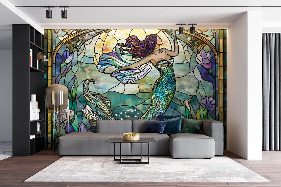 Scufundați-vă într-o lume subacvatică plină de culoare cu această pictură murală de perete care prezintă un design uimitor al unei sirene într-un vitraliu. Imaginați-vă sorbindu-vă cafeaua de dimineață în timp ce vă bucurați de nuanțele vesele de albastru și verde oceanic care se revarsă pe pereții dvs. Vârtejurile delicate și liniile fluide creează un sentiment de liniște care înmoaie orice spațiu. Imaginați-vă seri de film confortabile cu prietenii, în care toată lumea este atrasă de farmecul magic al sirenei. Această pictură murală nu doar decorează o cameră, ci invită poveștile, visele cu ochii deschiși și o notă de fantezie în viața de zi cu zi. Perfectă pentru iubitorii de natură sau pentru toți cei care doresc o atingere a mării în casa lor.