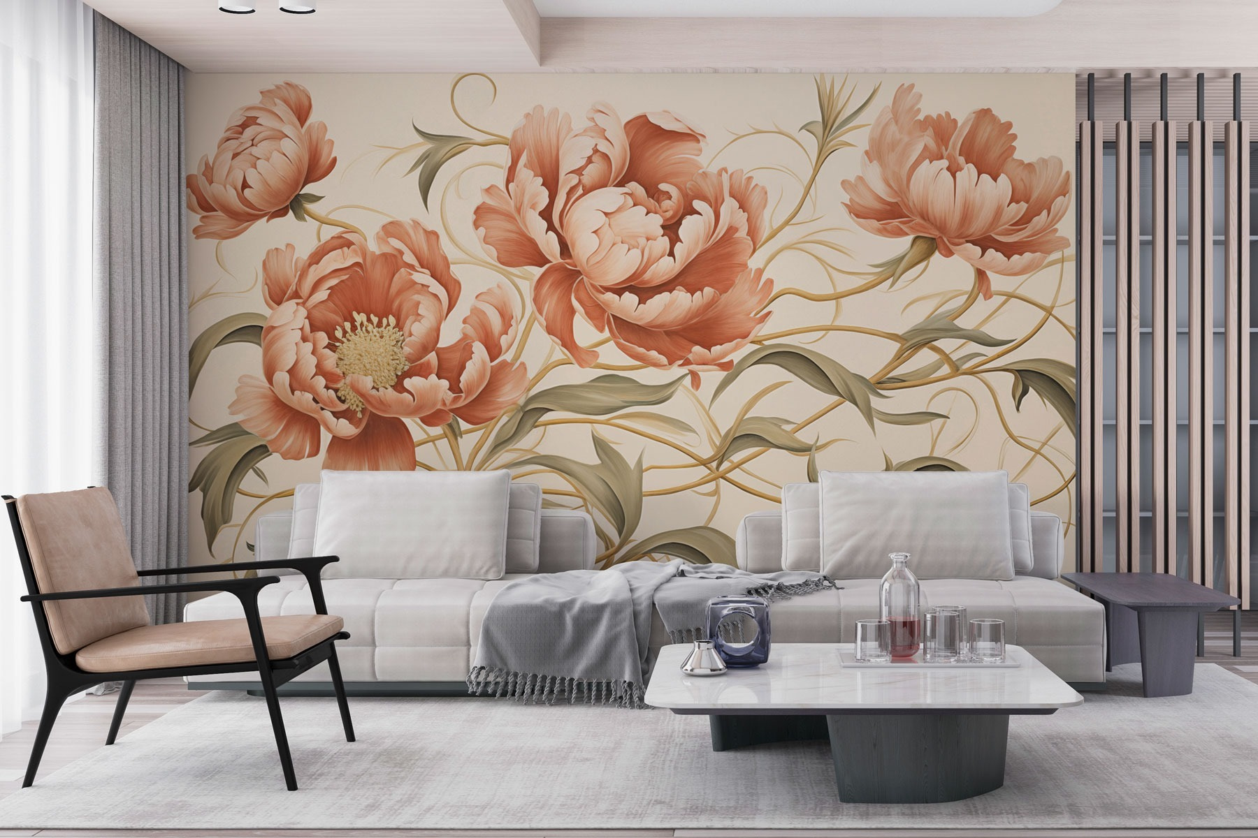 Transformați orice cameră într-un refugiu botanic confortabil cu această pictură murală uimitoare de flori și liane. Imaginați-vă – lumina soarelui pătrunzând, iar aceste bujori frumoase, în nuanțe de roz și piersică, dansând pe un fundal cald. Este ca și cum ai aduce o mică grădină în interior, fără a fi nevoie să o uzi!