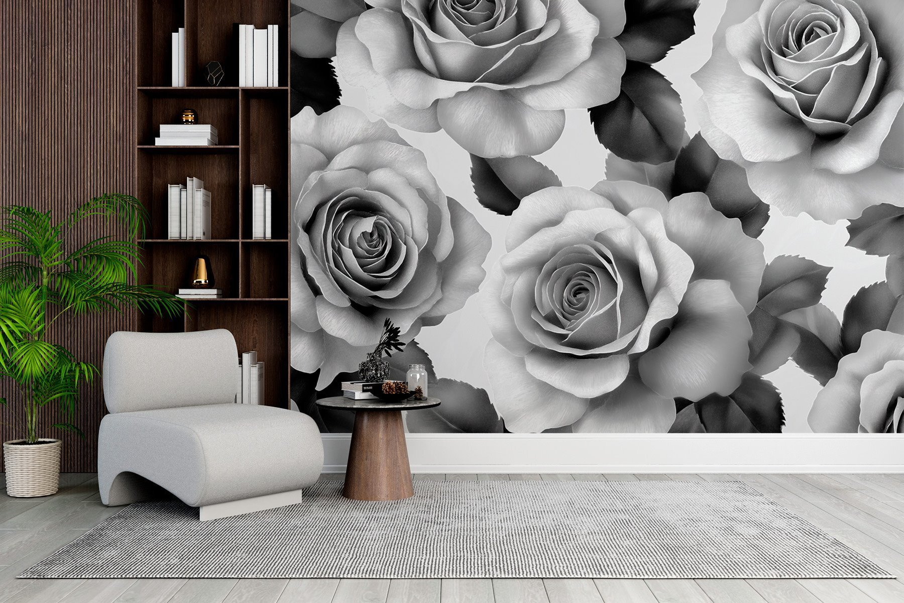 Transformați spațiul dvs. într-un tărâm al minunilor floral cu această pictură murală uimitoare care prezintă un grup de trandafiri eleganți și frunze luxuriante. Nu este doar o decorațiune; este ca și cum ai avea o grădină care nu se ofilește niciodată, chiar pe peretele tău! Imaginați-vă: vă relaxați cu o ceașcă de ceai, iar acești trandafiri negri și albi vă înconjoară, adăugând o notă de sofisticare și seninătate. Perfect pentru un colț de lectură confortabil sau o zonă de luat masa elegantă, acesta invită la căldură și conversație. Fie că lumina soarelui dansează pe petalele sale, fie că lumina lunii aruncă umbre moi, această pictură murală are un mod de a face fiecare moment să fie special. Pereții dvs. vor fi subiect de discuție în oraș – cine ar fi crezut că natura poate fi atât de elegantă?