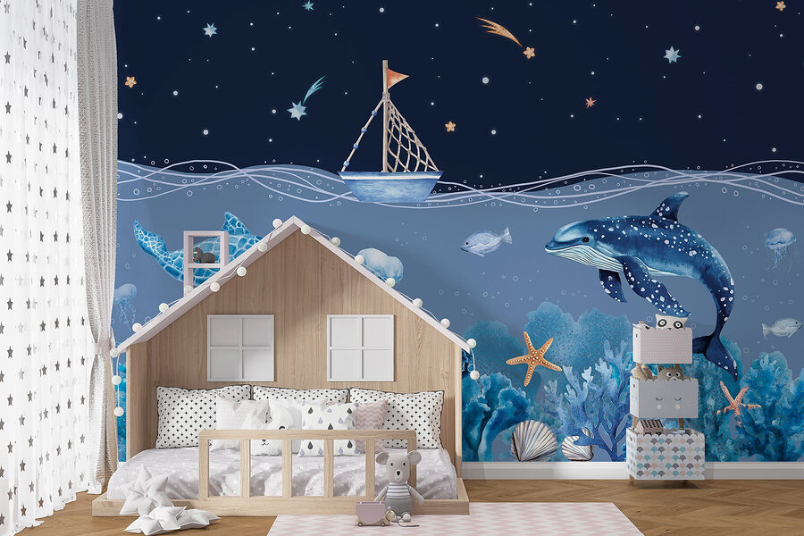 Transformați orice cameră într-o evadare subacvatică senină cu “Fototapet Sea Life with a Boat and a Whale”. Imaginați-vă o balenă jucăușă alunecând printr-o mare de vis în timp ce o barcă fermecătoare navighează deasupra. Este ca și cum ai avea o felie de ocean chiar pe peretele tău. Albastrul rece și verdele moale învăluie spațiul într-o îmbrățișare liniștitoare, făcând ca cafeaua de dimineață să pară un moment în paradis. Perfectă pentru camera unui copil sau pentru un colț de lectură confortabil, această pictură murală va stârni imaginația. Puncte bonus pentru povești – cine nu ar vrea să se scufunde în povești de aventură pe mare? Scufundați-vă și lăsați pereții să prindă viață!