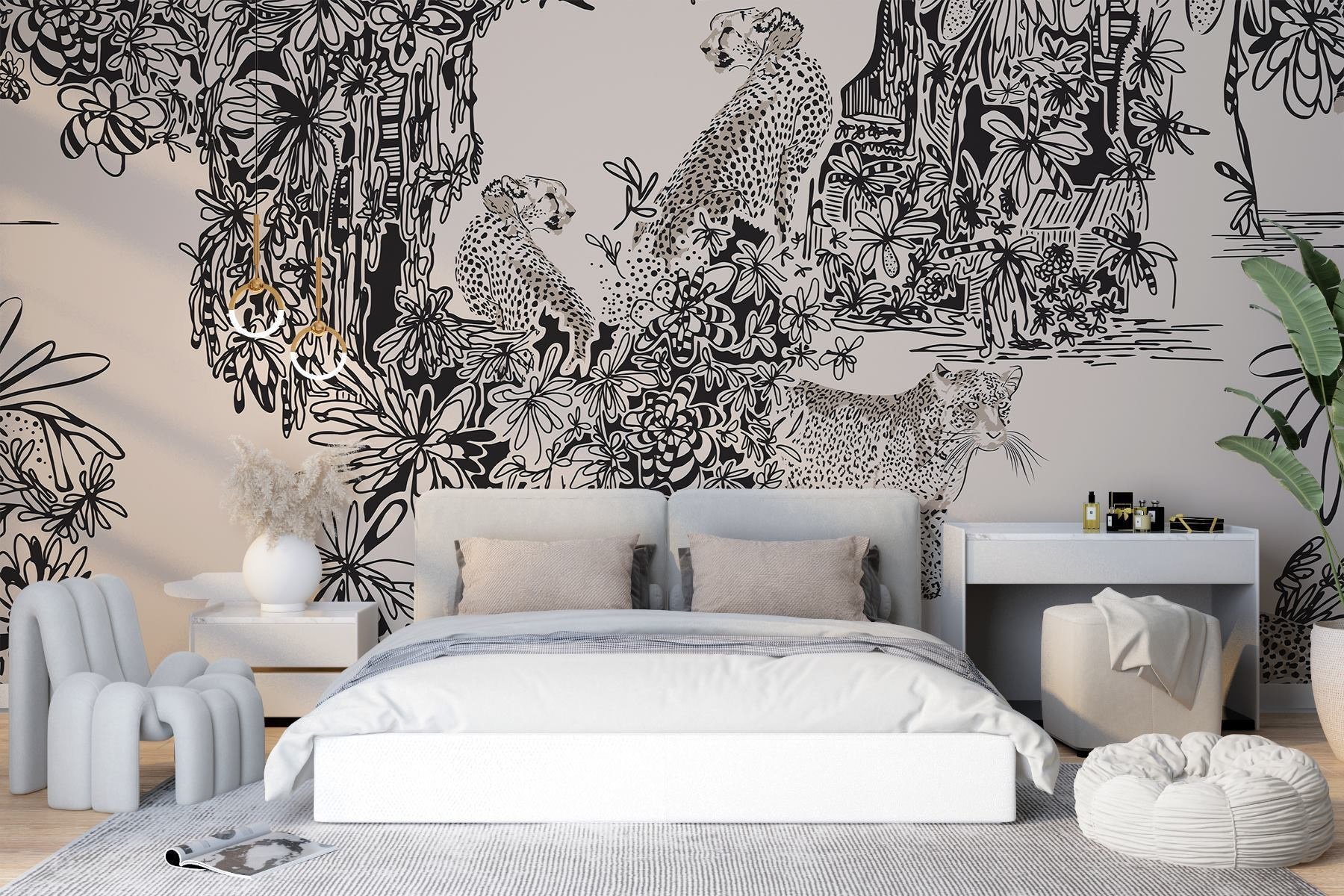 Transformați-vă spațiul într-un refugiu sălbatic cu această pictură murală uimitoare cu gheparzi grațioși printre plante luxuriante. Imaginați-vă că intrați într-o cameră care seamănă cu o junglă însorită, unde fiecare privire dezvăluie aceste feline elegante care se relaxează în habitatul lor natural. Designul complicat adaugă o notă de fantezie, făcându-l perfect pentru oricine iubește frumusețea naturii cu o întorsătură. Imaginați-vă că vă primiți prietenii în timp ce se minunează de acest fundal unic, stârnind conversații despre aventuri în sălbăticie. Este ca și cum ai avea un safari acasă, fără zborul lung! Fie că este pentru o cameră confortabilă sau pentru o cameră de copii vibrantă, această pictură murală țese o poveste de eleganță și aventură, aducând o felie din tropice direct pe pereții dvs.
