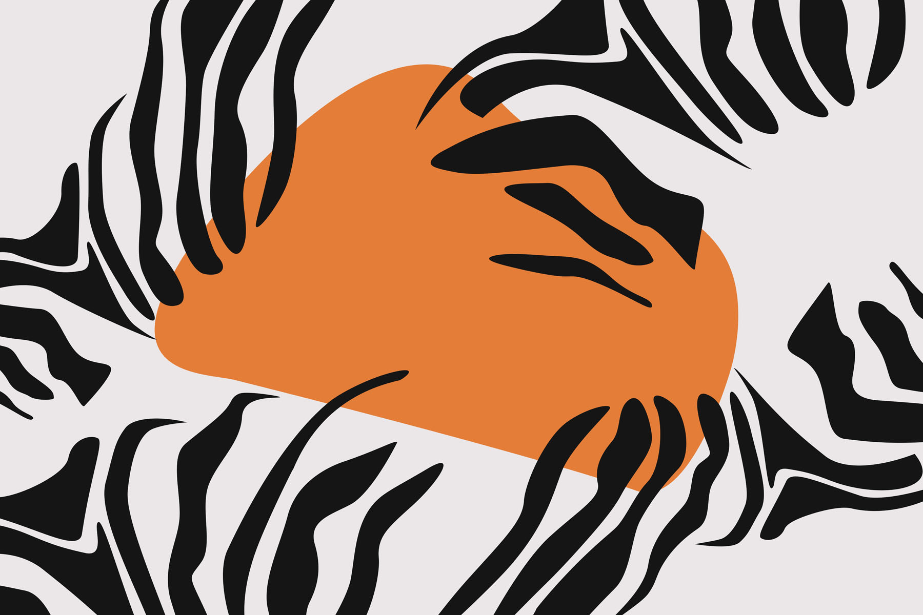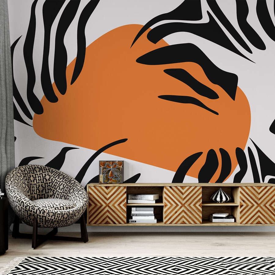 Transformarea unui spațiu poate părea uneori ca un truc magic, iar această pictură murală face exact acest lucru. “Modele dinamice în culori îndrăznețe” împrăștie o vibrație energică care va face pe oricine să facă o dublă privire. Imaginați-vă dungile vii albe și negre împletite cu un strop de portocaliu vibrant – este ca și cum opera de artă vă invită la o petrecere jucăușă în junglă, chiar în camera dvs. de zi.