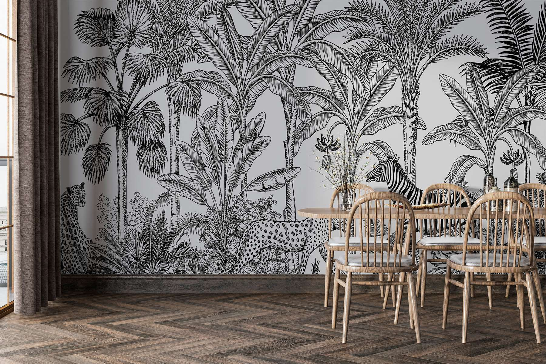 Transformați orice spațiu într-o aventură sălbatică cu această pictură murală încântătoare cu zebre și leoparzi relaxați într-o junglă luxuriantă. Imaginați-vă că vă plimbați în sufragerie și vă simțiți ca și cum ați pășit direct într-un paradis tropical. Detaliile complicate ale animalelor și frunzișul vibrant invită ochiul să exploreze, făcând din fiecare privire o mini-vacanță pentru simțuri.