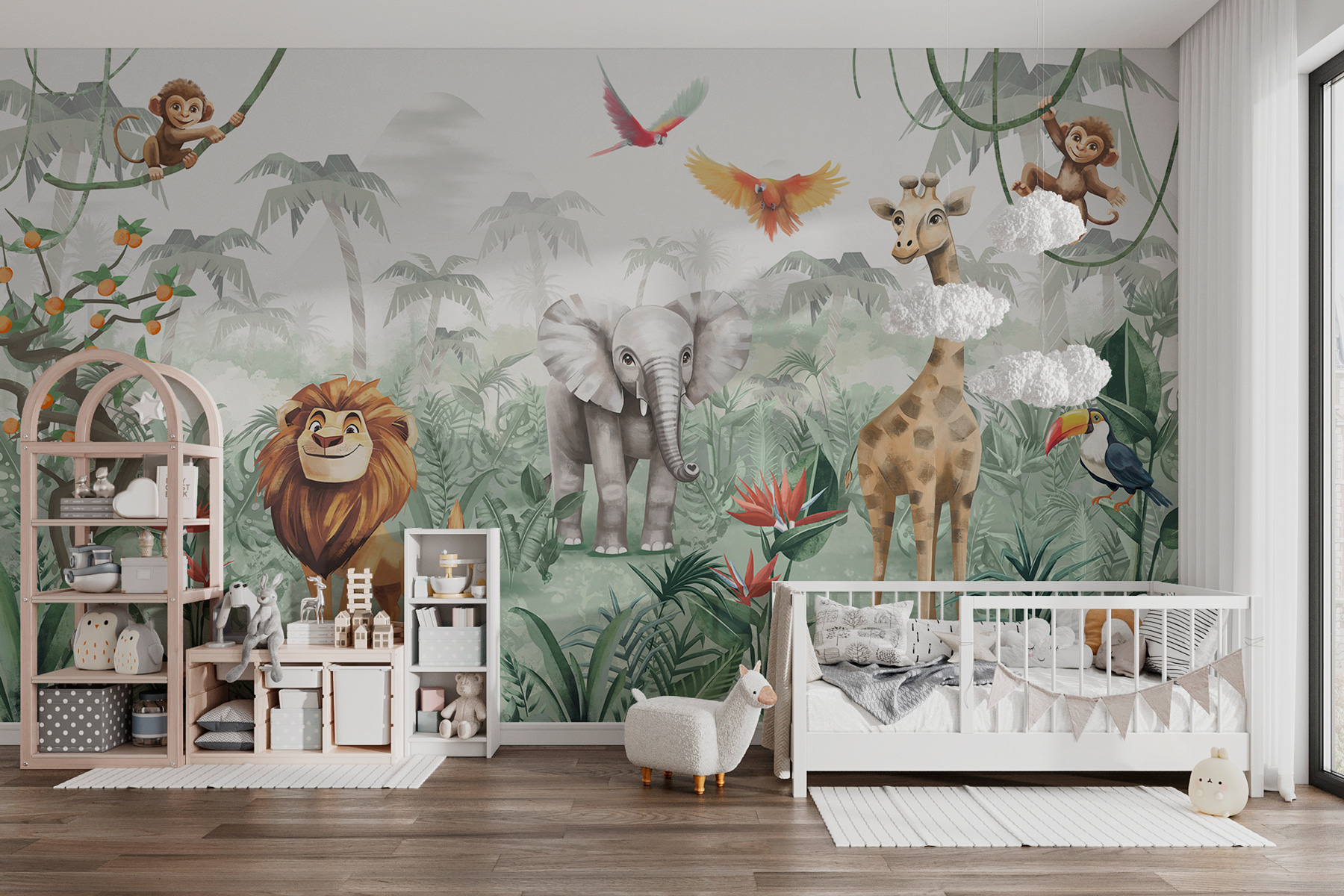 Transformați orice spațiu într-o aventură plină de viață în junglă cu această pictură murală fermecătoare! Imaginați-vă un elefant și un leu vesel care se joacă printre prieteni precum maimuțele și păsările colorate – este ca o petrecere pe peretele dumneavoastră! Această pictură murală aduce un sentiment de bucurie și uimire, perfect pentru a stimula imaginația copiilor sau pentru a adăuga o notă jucăușă oricărei camere. Imaginați-vă colțuri de lectură confortabile, în care cei mici explorează lumi noi, sau camere de joacă vesele, care seamănă cu un safari. Este ca și cum ai invita natura chiar în casa ta, fără curățenia murdară!
