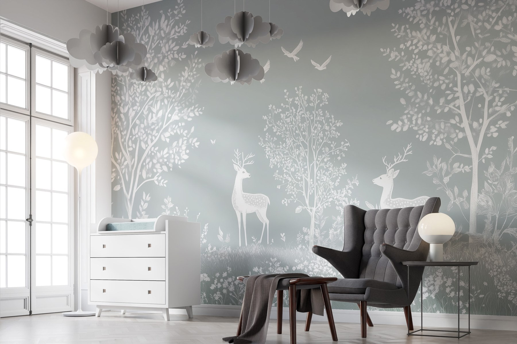 Transformați spațiul dvs. într-o evadare senină cu această pictură murală încântătoare cu căprioare albe grațioase care se plimbă într-o pădure moale, cu frunze. Imaginați-vă că pășiți în camera dvs. și vă simțiți ca și cum v-ați rătăcit într-o pădure de vis, plină de șoapte blânde ale naturii. Păsările delicate care zboară deasupra adaugă o notă de fantezie, fiind un fundal perfect pentru serile confortabile sau diminețile pline de inspirație. Este ca și cum ai avea un refugiu liniștit chiar la tine acasă! Fie că sorbiți un ceai sau citiți o carte, această pictură murală invită la acele mici momente dulci de calm. În plus, este un bun început de conversație – cine nu ar vrea să vorbească despre pădurea sa secretă?