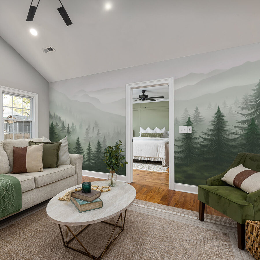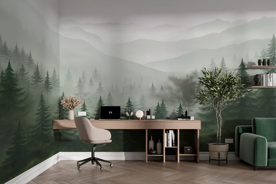 Transformați orice cameră într-o evadare senină cu acest uimitor mural “Peisaj cețos cu copaci și munți”. Imaginați-vă că vă îmbrățișați cu o ceașcă de ceai, înconjurați de îmbrățișarea blândă a pinilor impunători și a munților cețoși. Este ca și cum ați păși într-o pădure de vis, fără gândaci și pantofi noroioși. Verdele și griul blând creează o atmosferă liniștitoare, făcând-o perfectă pentru un colț de lectură relaxant sau un dormitor odihnitor. Aceasta șoptește: “Respiră adânc și relaxează-te”. Și cine nu are nevoie de asta? Fie că este un starter de conversație sau un fundal liniștit, această pictură murală adaugă o notă de natură pe pereții dvs.