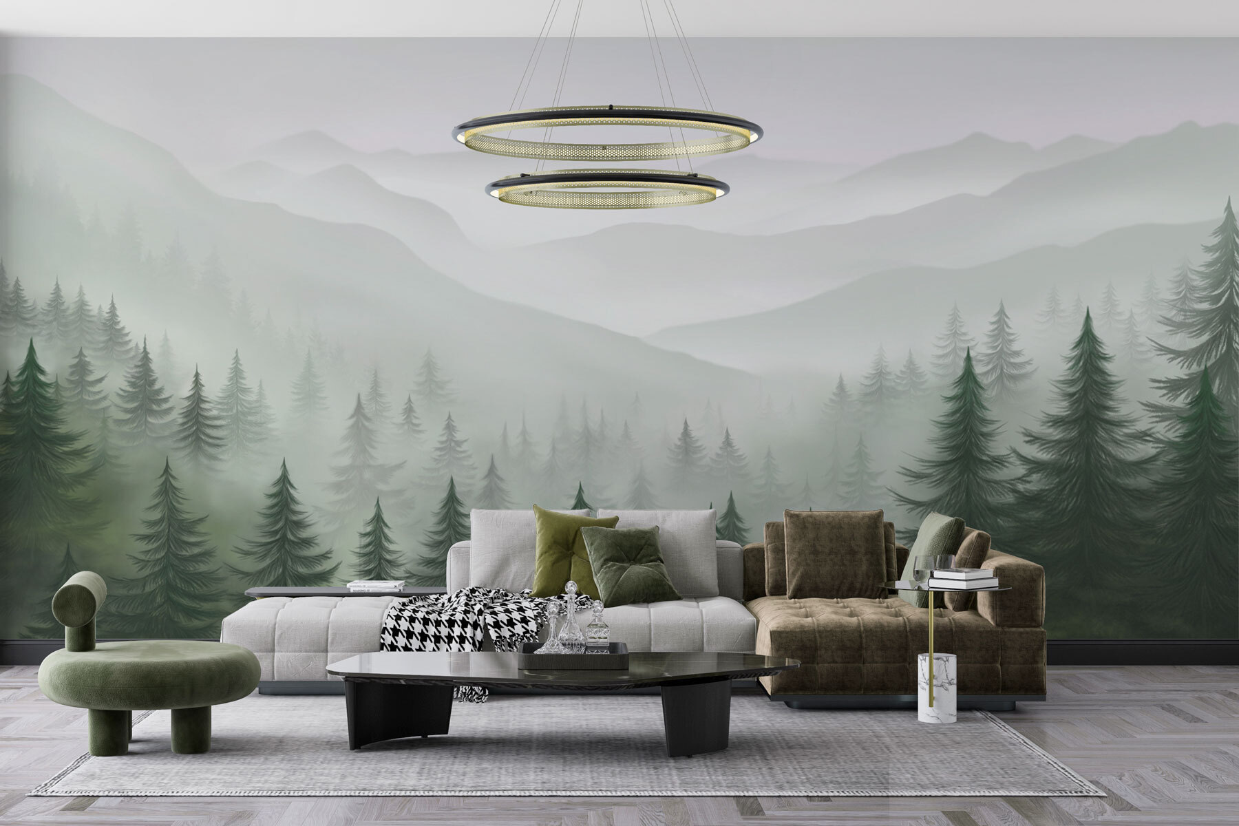 Transformați orice cameră într-o evadare senină cu acest uimitor mural “Peisaj cețos cu copaci și munți”. Imaginați-vă că vă îmbrățișați cu o ceașcă de ceai, înconjurați de îmbrățișarea blândă a pinilor impunători și a munților cețoși. Este ca și cum ați păși într-o pădure de vis, fără gândaci și pantofi noroioși. Verdele și griul blând creează o atmosferă liniștitoare, făcând-o perfectă pentru un colț de lectură relaxant sau un dormitor odihnitor. Aceasta șoptește: “Respiră adânc și relaxează-te”. Și cine nu are nevoie de asta? Fie că este un starter de conversație sau un fundal liniștit, această pictură murală adaugă o notă de natură pe pereții dvs.
