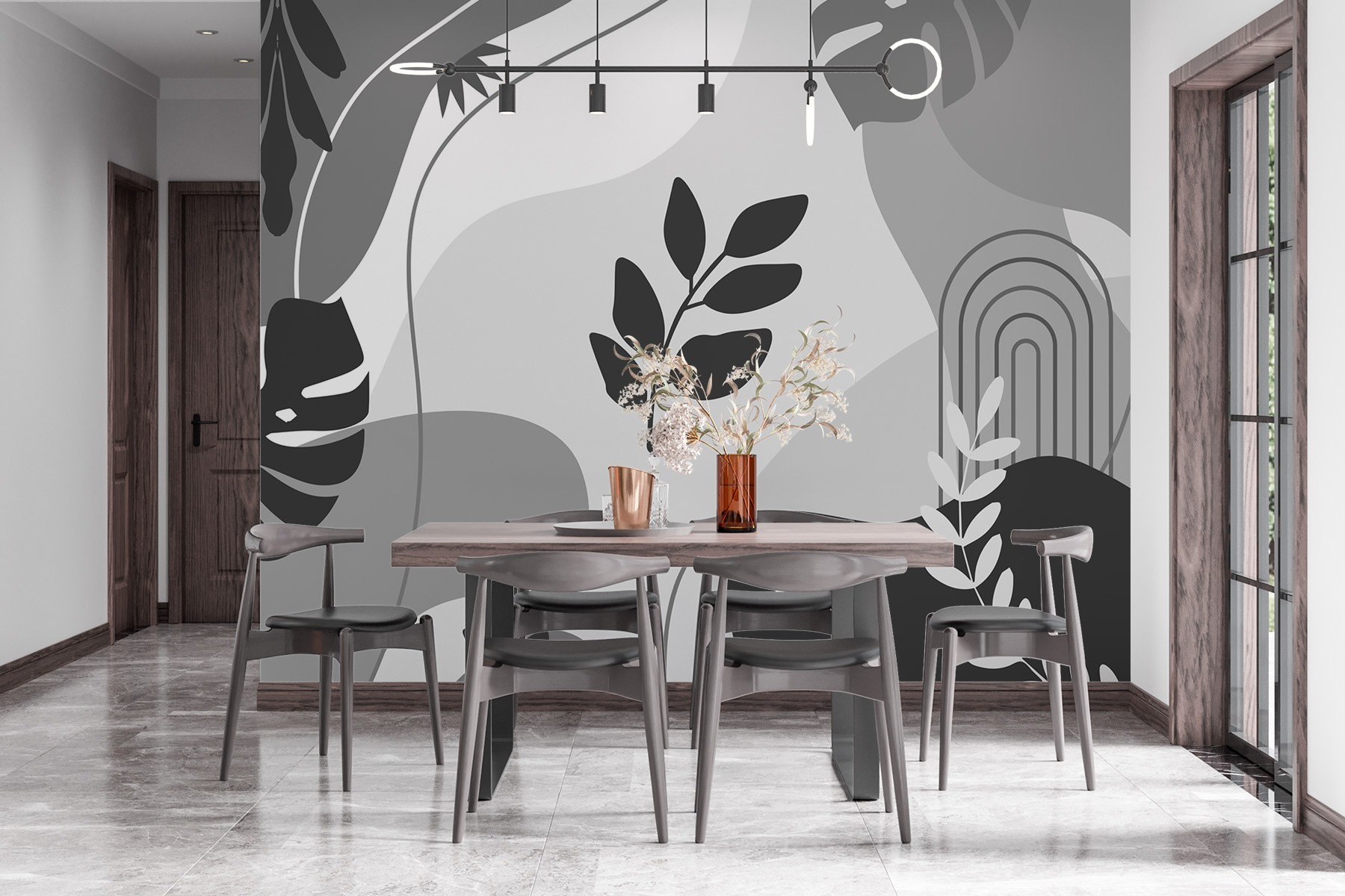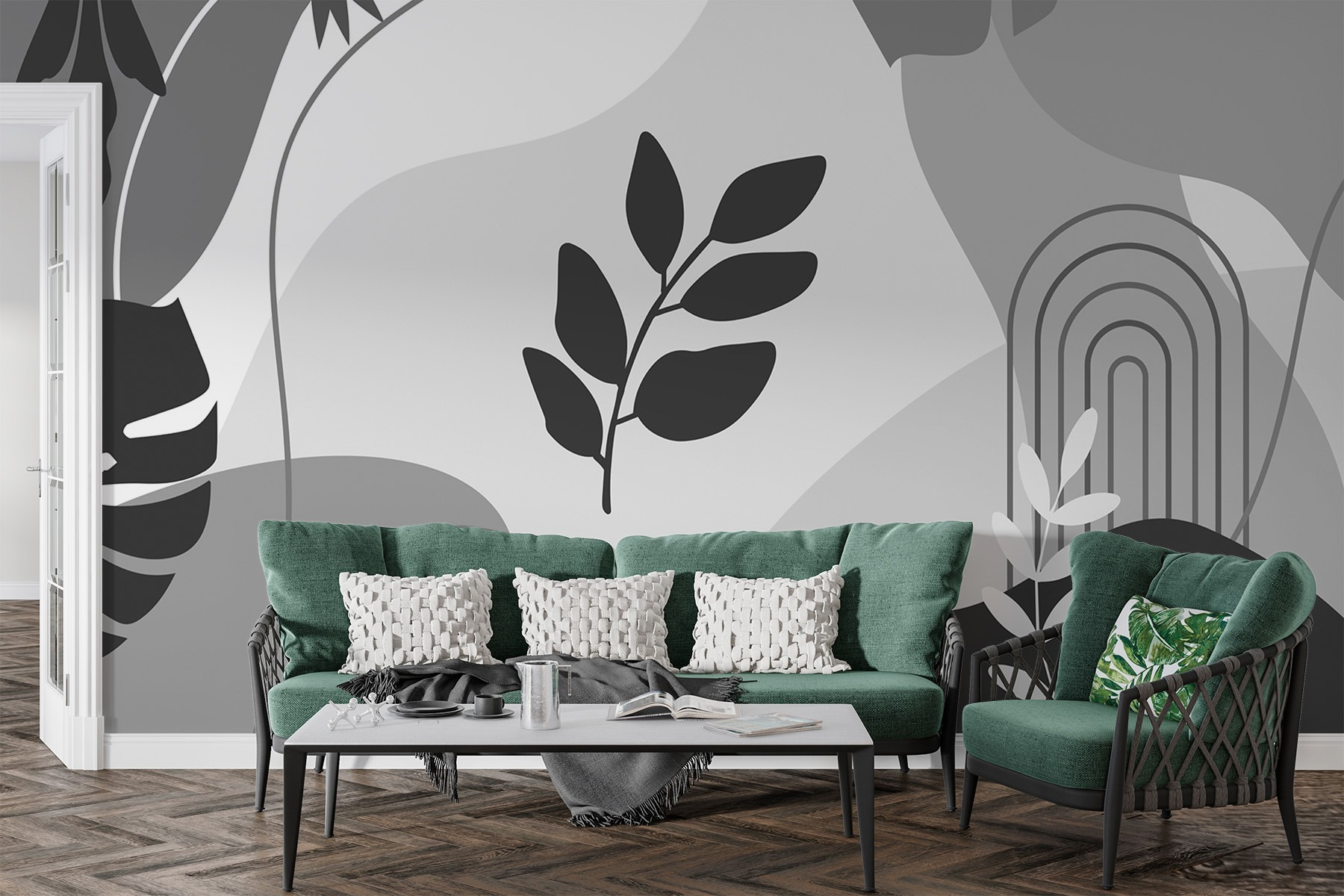 Transformați-vă spațiul cu această uimitoare pictură murală alb-negru care prezintă un dans jucăuș al frunzelor și plantelor. Este ca și cum ai aduce înăuntru aerul liber – fără insectele enervante, nu-i așa? Imaginați-vă sorbindu-vă cafeaua de dimineață înconjurat de acest frunziș șic, simțindu-vă inspirat și puțin aventuros. Formele curgătoare creează o atmosferă liniștitoare, perfectă pentru un birou confortabil sau un birou luminos. Este, de asemenea, un bun început de conversație – credeți-ne, prietenii nu vor arunca doar o privire și vor pleca; vor dori să știe de unde provine această frumusețe. Stilul întâlnește natura într-un mod încântător!