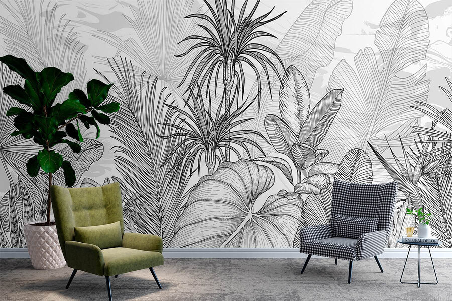 Transformați-vă spațiul cu această uimitoare pictură murală în alb și negru, care surprinde frumusețea complexă a plantelor tropicale. Imaginați-vă că pășiți într-o junglă senină de fiecare dată când intrați în cameră. Aceste contururi de frunze sunt ca o grădină secretă elegantă care complimentează orice decor – perfect pentru a crea un colț de lectură confortabil sau o zonă de luat masa vibrantă. Contrastul formelor îndrăznețe pe un fundal moale invită la imaginație jucăușă. Lăsați frumusețea blândă a naturii să inspire relaxare și, cine știe? Prietenii tăi ar putea crede că ai acasă o mini-pădure tropicală.