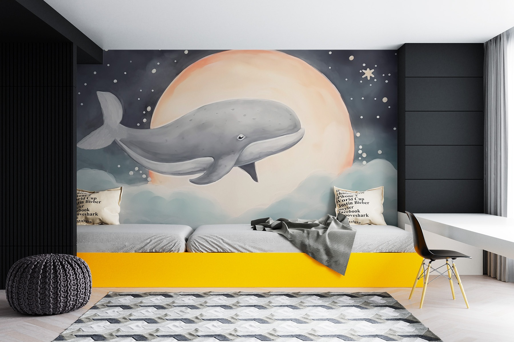 Faceți cunoștință cu pictura murală “Whale in the Sky”, unde magia oceanului se întâlnește cu norii de vis. Imaginați-vă această balenă maiestuoasă alunecând liniștită într-o noapte înstelată, emițând o vibrație senină în orice spațiu. Este ca și cum ai aduce o bucată de ocean în casa ta – fără apă sărată, desigur. Perfectă pentru o temă de coastă sau chiar pentru o cameră de copil capricioasă, ea stârnește curiozitate și uimire. Imaginați-vă seri confortabile petrecute contemplând acest gigant blând – cine nu s-ar simți puțin mai relaxat? Cu nuanțele sale moi de acuarelă și atmosfera primitoare, această pictură murală face din orice perete un subiect de conversație. Scufundați-vă în decorul care se simte ca o îmbrățișare de la mare!