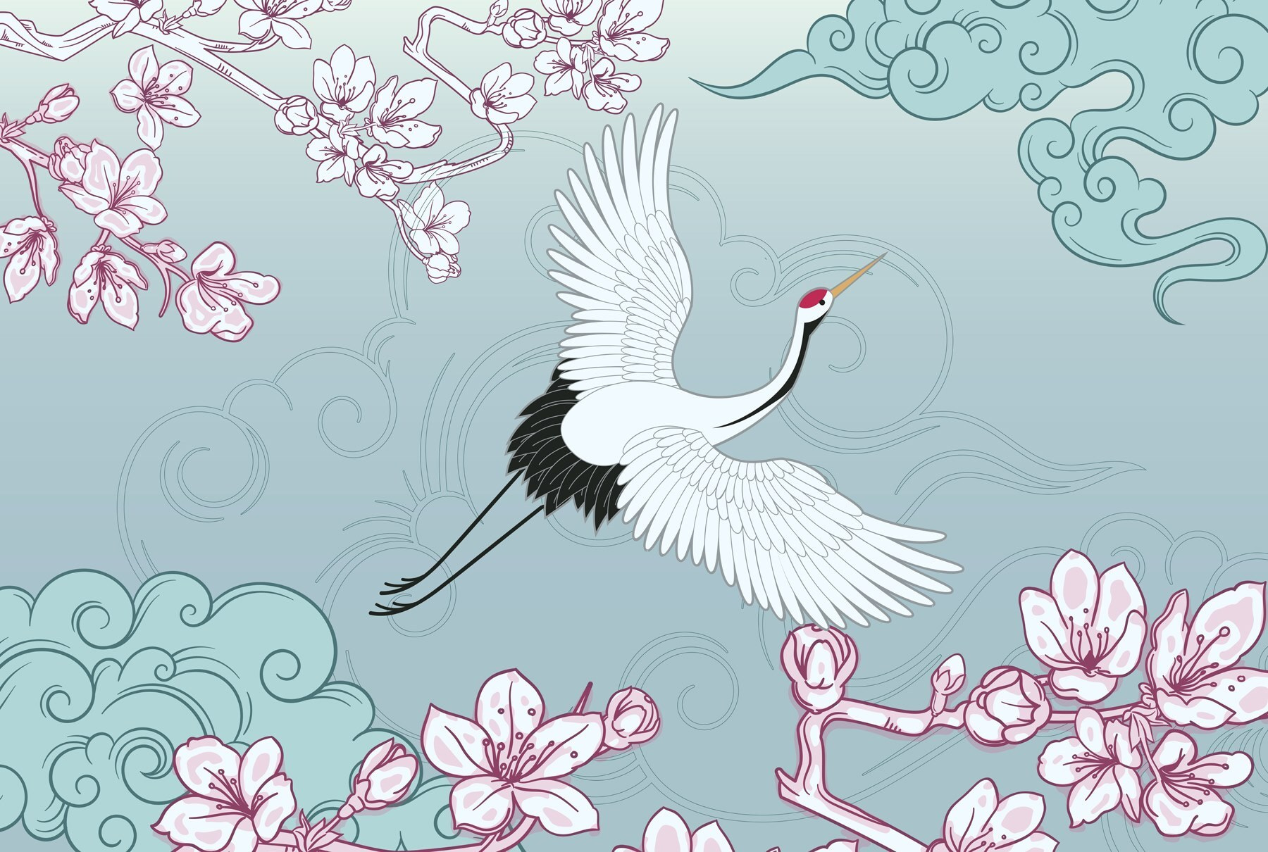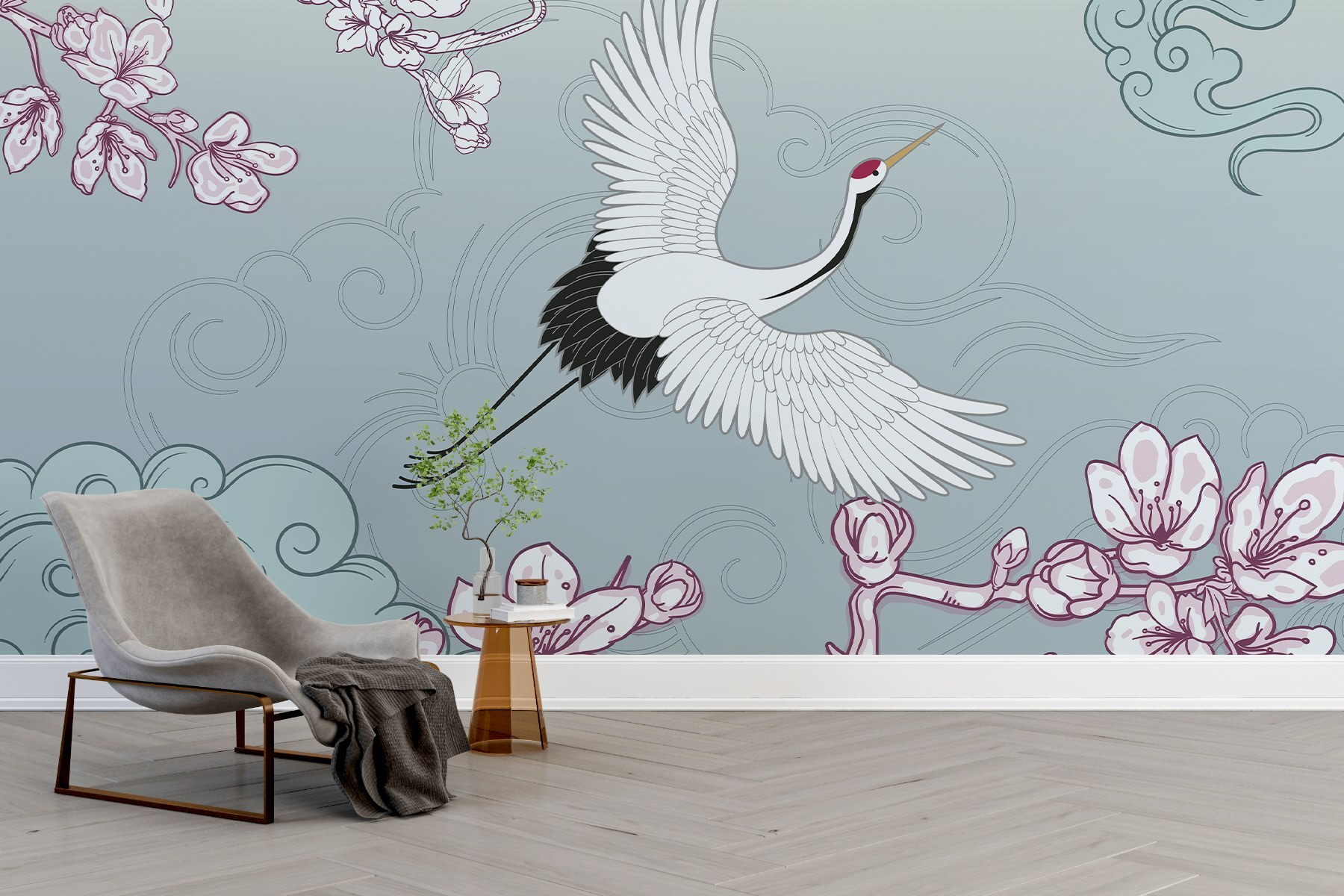 Transformați-vă spațiul cu această pictură murală încântătoare cu o pasăre grațioasă care zboară pe cer. Este ca și cum ai avea o felie de natură chiar în casa ta, îmbinând frumos culori și modele care emană calm și liniște. Imaginați-vă că vă treziți în fiecare zi la vederea senină a florilor de cireș și a unui cocor maiestuos, aducând o notă de zen chiar în sufrageria dvs. Perfect pentru momentele în care aveți nevoie de o mică evadare – chiar dacă este vorba doar de ziua de spălat rufe! Această pictură murală nu decorează doar un perete; spune o poveste și invită pe toată lumea înăuntru. Perfect pentru orice colț care tânjește după caracter, făcând din fiecare privire o mini evadare.