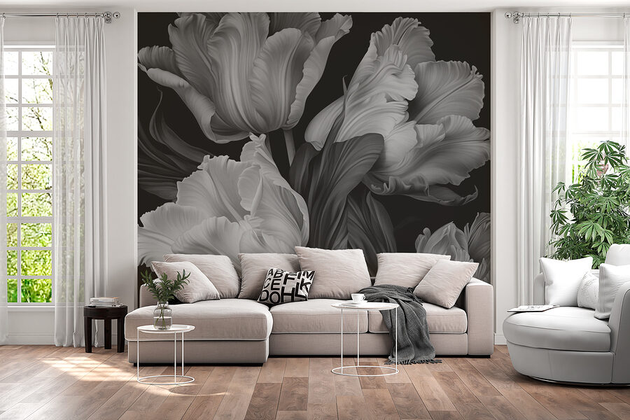 Transformați orice cameră cu această pictură murală uimitoare cu lalele elegante în tonuri monocrome. Este ca și cum ai avea o operă de artă pe perete, fără să plătești intrarea la muzeu. Imaginați-vă că vă relaxați cu o băutură caldă, contemplând aceste lalele care se leagănă grațios – atât de liniștitoare, dar izbitoare. Contrastul dintre alb și negru adaugă un pic de dramatism, perfect pentru acele zile mohorâte în care vrei doar să te cuibărești în casă. Oaspeții ar putea chiar să se oprească, hipnotizați, întrebându-se dacă au pășit într-o țară a minunilor florale. Simplitatea totul pare răcoritor de șic – cui nu-i place asta? Această pictură murală are farmec, rafinament și o notă de fantezie. Este arta murală care face o declarație.