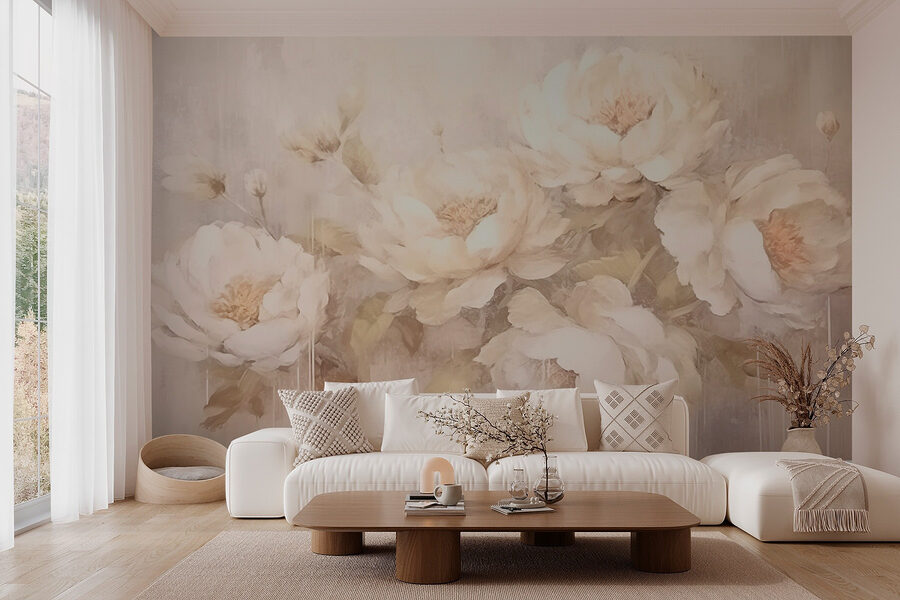 Transformați orice cameră cu această superbă pictură murală de flori albe. Imaginați-vă acest lucru: un spațiu confortabil în care aceste bujori moi și înflorite par să danseze pe perete, aducând o adiere de aer proaspăt în casa dvs. Nu sunt doar flori; sunt o îmbrățișare blândă pentru ochi. Imaginați-vă sorbind un ceai în timp ce priviți tușele delicate, simțindu-vă calmi și inspirați în același timp. Este ca și cum pereții tăi ar avea o grădină secretă, plină de liniște și farmec. Perfectă pentru cei care tânjesc după o atingere a naturii în interior, această pictură murală este ca și cum ai invita primăvara în viața de zi cu zi.