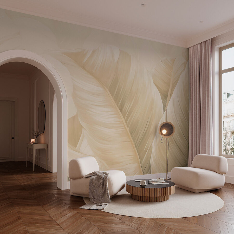 Imaginați-vă că pășiți într-o lume a texturilor moi și a tonurilor atenuate, unde fiecare privire la perete se simte ca o îmbrățișare blândă. Această pictură murală, cu designul său liniștitor cu frunze de palmier, vorbește despre paradisuri tropicale, în timp ce fundamentează orice spațiu cu prezența sa senină. Imaginați-vă seri confortabile, lumini calde și acel amestec perfect de natură și calm. Prietenii s-ar putea opri în mijlocul conversației, captivați de frumusețea discretă de pe perete. Este ca și cum ai aduce o bucată dintr-o pădure liniștită în casa ta – cu excepția țânțarilor! Perfect pentru sufragerii, dormitoare sau chiar pentru acele mici colțuri care așteaptă puțină dragoste.
