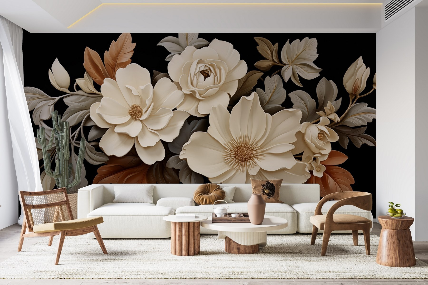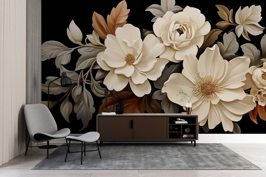 Transformați orice spațiu cu această pictură murală uimitoare care prezintă un grup de flori albe delicate cuibărit printre frunze maro calde. Este ca și cum ai aduce o bucățică de natură în interior, fără polenul deranjant! Imaginați-vă că vă treziți în fața acestei priveliști elegante – cât de revigorant, nu-i așa? Florile moi, cremoase, ies în evidență pe un fundal negru elegant, adăugând o eleganță neașteptată. Perfectă pentru un dormitor confortabil sau o cameră de zi elegantă, această pictură murală aduce un vibe calm, dar sofisticat. Nu este doar un decor; este o experiență, o gură de aer proaspăt pe pereții tăi! Așa că dă-i drumul, lasă-ți pereții să înflorească!