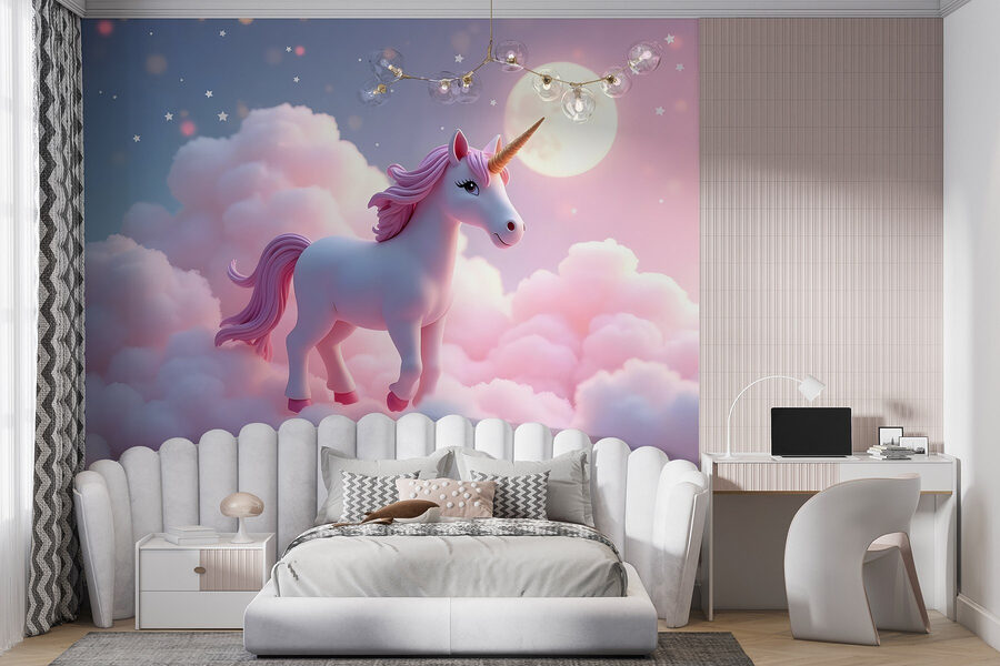 Transformați orice cameră într-un tărâm al minunilor capricios cu această pictură murală încântătoare, cu un unicorn care se țopăie pe nori pufoși. Imaginați-vă magia pe care o va aduce, adăugând un strop de farmec visător spațiului dvs. Perfectă pentru camera unui copil sau chiar pentru un refugiu jucăuș al unui adult, inspiră vise cu ochii deschiși și sclipește cu imaginație.