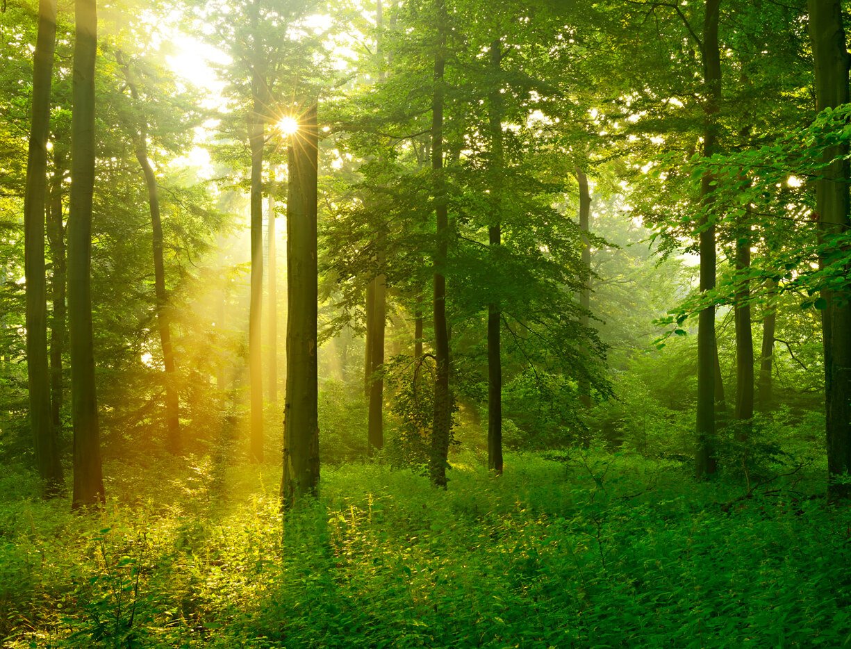 Fototapet Lumina soarelui curge prin pădurea luxuriantă