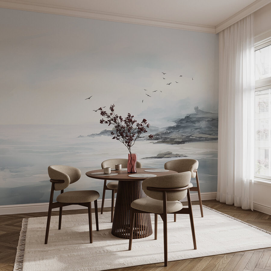 Transformați orice cameră cu această pictură murală încântătoare, “Păsări zburând deasupra unei plaje stâncoase”. Imaginați-vă că vă treziți cu nuanțele blânde ale oceanului și cu aceste păsări de vis care navighează pe cer. Este ca o mini-vacanță chiar pe peretele tău! Culorile blânde creează o atmosferă liniștitoare, perfectă pentru un spațiu de locuit răcoros sau un dormitor liniștit.