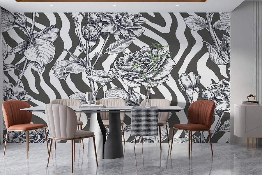 Transformați-vă pereții într-o sărbătoare vizuală uimitoare cu această pictură murală cu trandafiri alb-negru. Este ca și cum ai avea o grădină care nu se ofilește niciodată, mai puțin cutia de udat și insectele ocazionale. Florile delicate dansează pe un fundal elegant, cu dungi, adăugând un pic de margine fără a exagera. Imaginați-vă sorbindu-vă cafeaua de dimineață sau relaxându-vă cu o carte, înconjurați de această frumusețe florală elegantă. Fie că este pentru o cameră de zi confortabilă sau pentru un birou elegant, această pictură murală aduce o notă de farmec al naturii cu o întorsătură modernă. Perfect pentru oricine dorește un strop de personalitate – nu este nevoie de degete verzi!