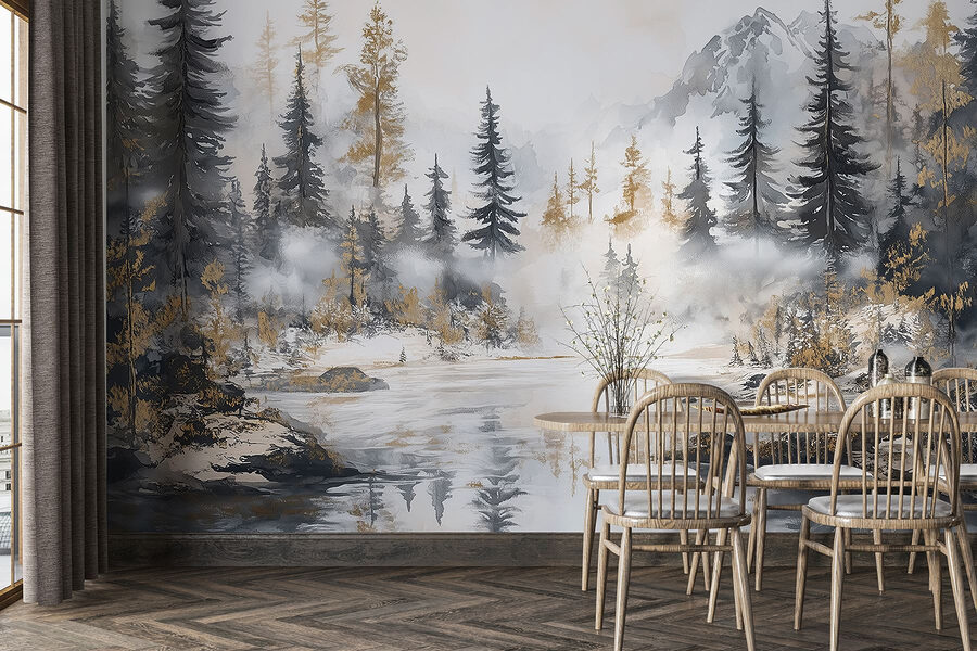 Transformați-vă spațiul într-o evadare senină cu această pictură murală uimitoare în acuarelă a unei păduri și a munților. Este ca și cum ați aduce calmul naturii în interior, fără mușcături de insecte și pantofi plini de noroi. Imaginați-vă seri confortabile petrecute lângă “foc” (sau doar o lumânare pâlpâitoare) în timp ce priviți copacii cețoși și vârfurile înalte – cine are nevoie de bocanci de drumeție când aveți această frumusețe pe perete? Perfectă pentru o cameră de zi sau pentru un colț liniștit de lectură, această pictură murală șoptește relaxare. Este un memento artistic pentru a respira adânc și a lăsa natura să-și facă magia, chiar în casa ta.