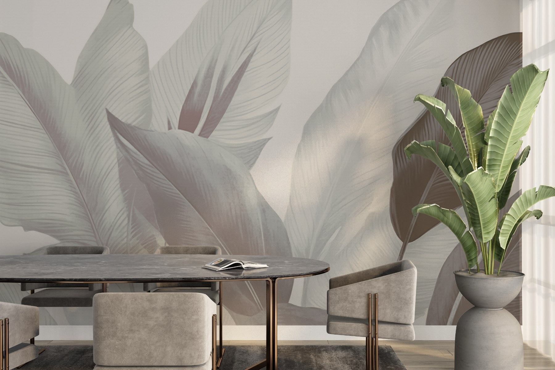 Transformați orice cameră într-un refugiu senin cu pictura murală “Soft Leaves in Gentle Tones”. Imaginați-vă acest lucru: după-amieze leneșe petrecute sorbind ceai, înconjurați de ritmul liniștitor al naturii – fără a ieși vreodată din casă. Nuanțele blânde și frunzișul delicat șoptesc practic relaxare. Fie că este vorba de un colț de lectură confortabil sau de o cameră de zi vibrantă, această pictură murală aduce o notă de farmec tropical care echilibrează sofisticarea și căldura. Este ca și cum ai invita o grădină luxuriantă direct pe pereții tăi. Imaginați-vă doar conversațiile și seninătatea pe care le va inspira. Cine nu și-ar dori asta?