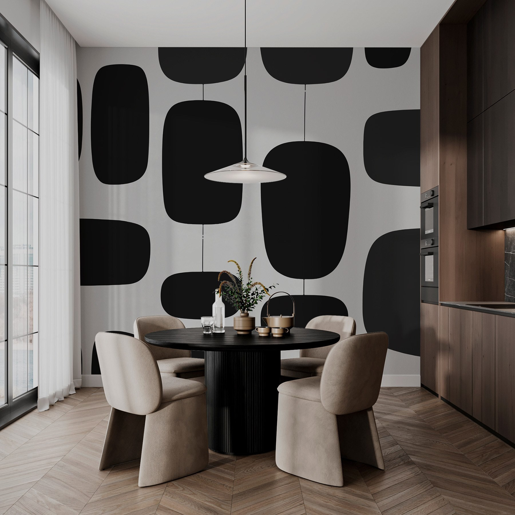 Transformați-vă spațiul cu această uimitoare pictură murală în alb și negru – vorbiți despre o piesă statement! Modelul jucăuș de forme variate adaugă o notă de fler modern, perfect pentru a vă îmbunătăți decorul. Imaginați-vă că pășiți în camera dvs. și simțiți o schimbare instantanee a vibrației. Este ca și cum arta ar insufla viață pereților dvs.