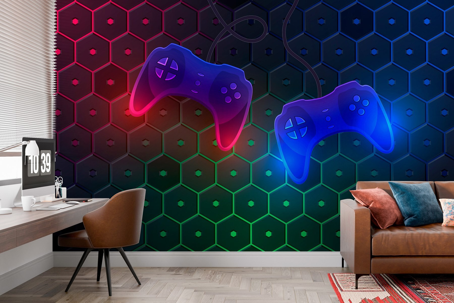 Transformați-vă spațiul cu o explozie de creativitate! Această pictură murală hipnotizantă, cu controlere de jocuri vibrante pe un fundal hexagonal, este ca o invitație jucăușă de a pătrunde în lumea jocurilor. Imaginați-vă ieșind cu prietenii, râsetele răsunând în timp ce vă provocați reciproc, totul sub strălucirea acestor controlere colorate. Nu este doar decor; este o vibrație – un starter de conversație distractiv care aduce energie în orice cameră. Amestecul de culori îndrăznețe și modele geometrice adaugă o notă modernă care menține lucrurile proaspete. Perfect pentru peșterile gamerilor, camerele copiilor sau orice spațiu care tânjește după un strop de personalitate. Vă veți trezi zâmbind de fiecare dată când treceți pe acolo – este aproape ca și cum pictura murală vă provoacă la revanșă!