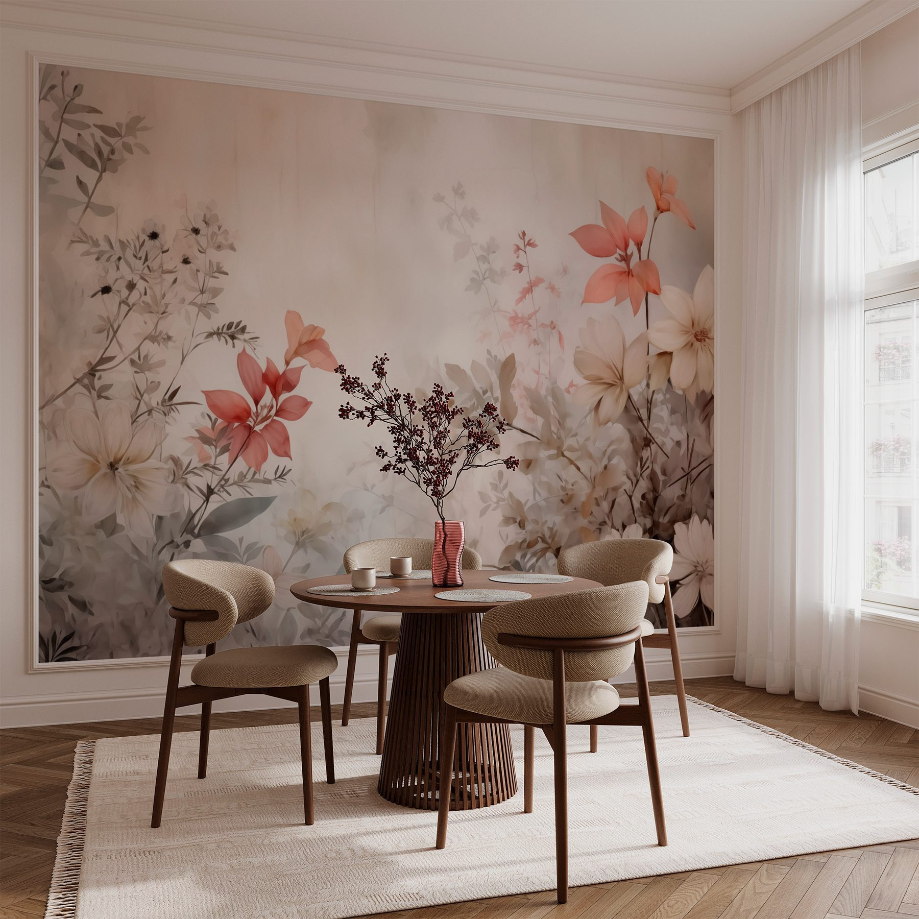 Transformați orice perete într-o oază de seninătate cu această pictură murală încântătoare de flori. Imaginați-vă că pășiți într-un vis, unde florile moi dansează în nuanțe blânde, creând o atmosferă care este atât liniștitoare, cât și înălțătoare. Este ca și cum ați aduce o gură de aer proaspăt în interior – perfect pentru un colț de lectură confortabil sau o intrare senină. Efectul de acuarelă adaugă un farmec fluid, aproape ca o briză ușoară plutind printr-o grădină. Prietenii s-ar putea să se oprească și să întrebe dacă cineva a lăsat ușa către natură larg deschisă. Perfect pentru cei care apreciază un pic de fler floral fără a fi nevoiți să întrețină plantele adevărate!