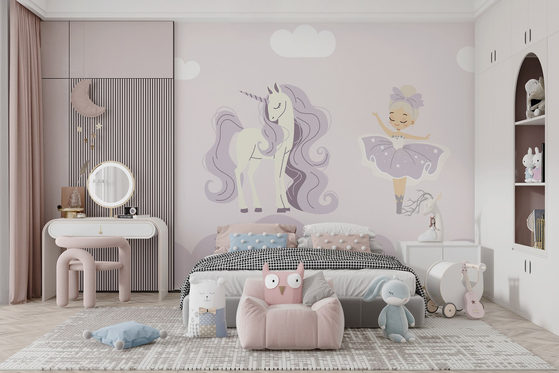 Transformați orice spațiu într-o țară a minunilor capricioasă cu “Fototapet Unicorn and a Ballerina”. Imaginați-vă acest lucru: un unicorn minunat și o balerină grațioasă dansând pe un cer pastelat de vis. Este ca și cum ai avea o bucățică de magie chiar pe peretele tău! Copiii (și, să fim sinceri, și adulții) se pot pierde în imaginația lor, visând la rotiri și sclipiri. Perfectă pentru o cameră de joacă sau un dormitor, această pictură murală poate face chiar și cel mai plictisitor perete să semene cu un basm. Imaginați-vă zâmbetele prietenilor care vor trece pe aici – tuturor le plac poveștile cu unicorni, nu-i așa? Este moale, fermecător și atât de inspirat – cel mai bun fundal pentru aventuri și vise cu ochii deschiși!