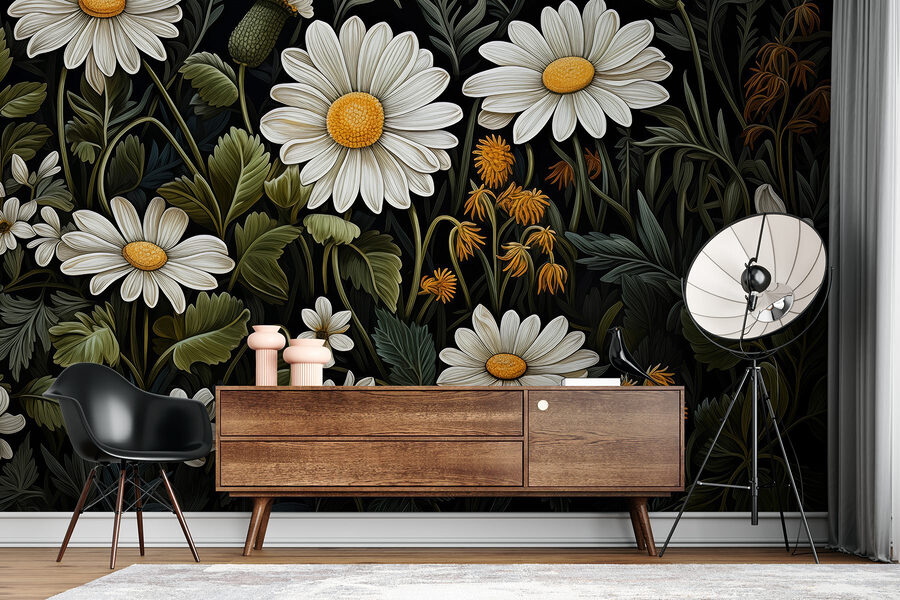 Transformați orice cameră într-un paradis botanic cu acest tapet uimitor, care prezintă o frumoasă varietate de flori și frunze. Imaginați-vă că intrați în spațiul dvs. și sunteți întâmpinați de aceste margarete supradimensionate, ale căror petale vesele aproape că șoptesc secretele zilelor însorite. Fundalul profund îi conferă o notă dramatică, făcând ca aceste flori să iasă în evidență, ca și cum ar fi gata pentru o serată de vară. Perfect pentru sufragerie sau chiar pentru un colț confortabil, acest tapet vă aduce natura în casă, fără a fi nevoie să vă faceți griji cu udatul! Cine nu s-ar simți puțin mai fericit scufundându-se în această țară a minunilor florale? Fie că stârnește bucurie sau doar aduce un strop de natură în interior, este sigur că va fi un subiect de conversație. Așadar, așezați-vă confortabil și bucurați-vă de priveliște!