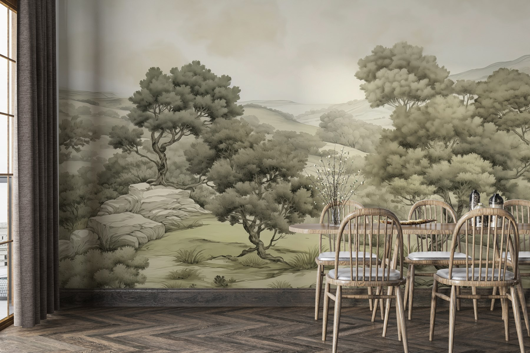 Transformați-vă spațiul într-un refugiu liniștit cu acest tapet uimitor, „Peisaj cu copaci și stânci”. Imaginați-vă că vă treziți în fiecare dimineață simțindu-vă ca și cum ați păși într-o pădure liniștită – ce revigorant! Tonurile moi și discrete evocă o senzație de calm, făcându-l perfect pentru sufragerii sau colțuri confortabile. Este ca și cum ați aduce o mică bucată de natură în interior, fără să vă faceți griji că insectele enervante sau vremea vă vor strica atmosfera.