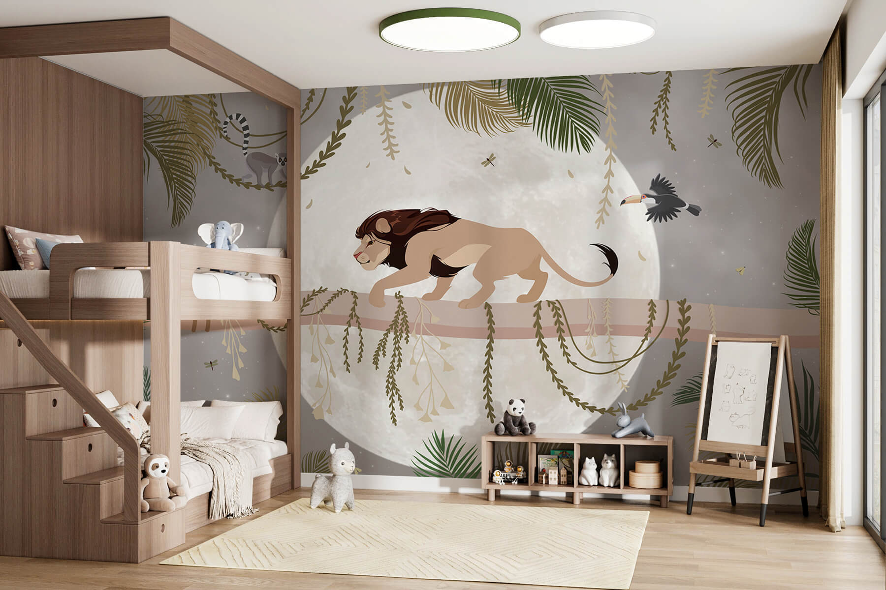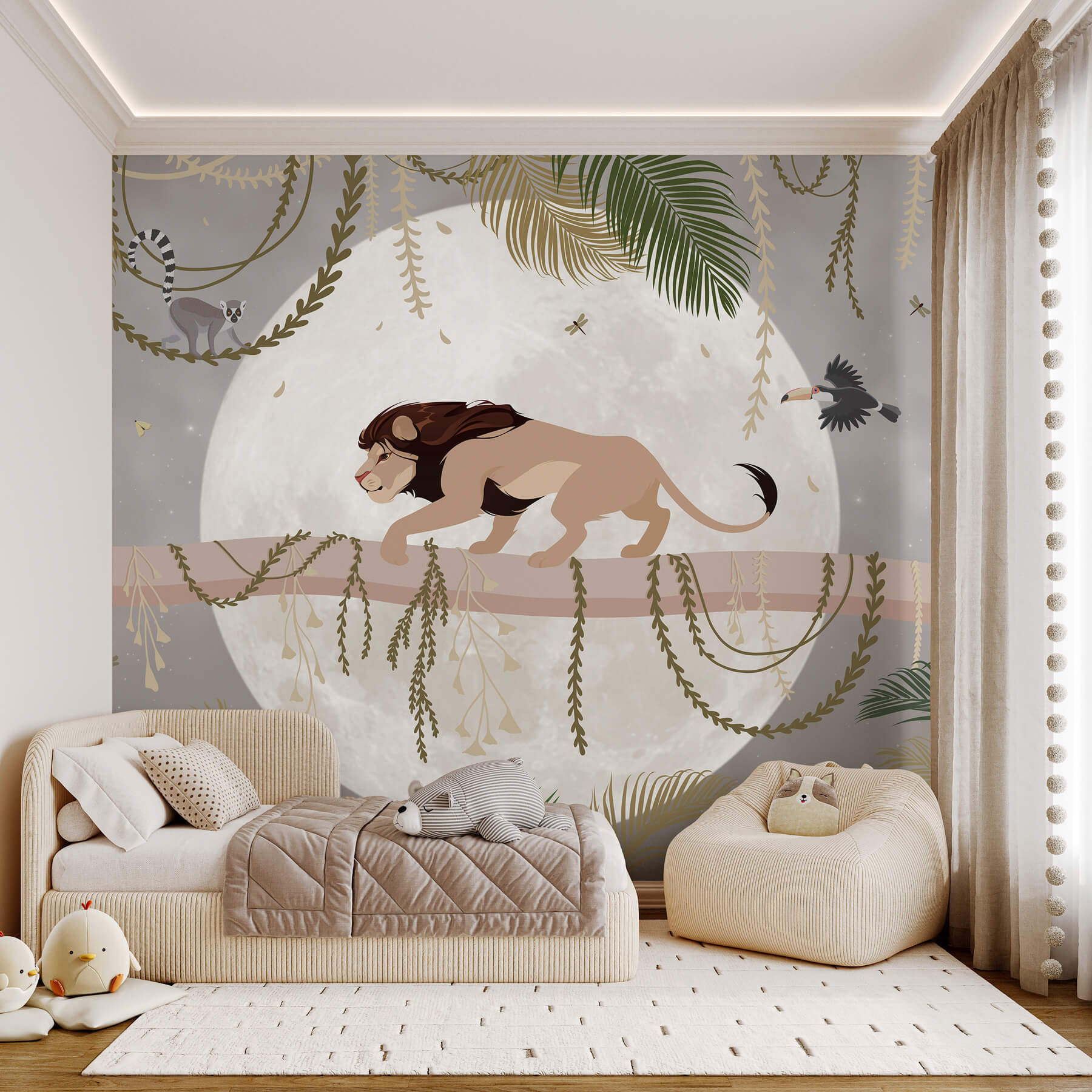 Fie că se află într-un colț confortabil de lectură sau într-o zonă de joacă pentru copii, acest mural te invită să visezi puțin și să călătorești mult – perfect pentru a stârni acele călătorii imaginare. Cine ar fi crezut că pereții pot avea un astfel de caracter? În plus, acel lemur jucăuș și tucanul care se năpustește? Subiecte de conversație instantanee!