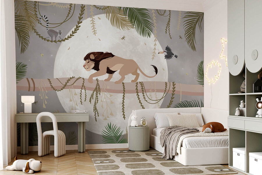 Vă prezentăm un mural care emană farmec sălbatic – „Leul pe o ramură de copac”. Imaginați-vă această creatură regală pășind cu încredere pe o ramură, încadrată de frunze care se leagănă și de o lună de vis. Este ca și cum ați aduce o bucată din tropice direct în sufrageria dvs. Fiecare privire vă oferă o doză de aventură, nu credeți?