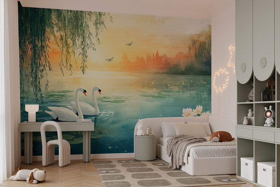 Scufundați-vă în liniște cu muralul „Două lebede pe un lac” – este ca o îmbrățișare a naturii! Acest design prezintă lebede grațioase care alunecă pe un lac liniștit, cu lumina soarelui filtrându-se prin copaci. Este perfect pentru a transforma orice cameră într-un refugiu pașnic. Imaginați-vă că savurați cafeaua de dimineață, înconjurați de această scenă blândă, sau că vă cufundați într-o carte bună, în timp ce atmosfera încântătoare vă transportă departe. Culorile subtile și atmosfera calmă adaugă o notă de eleganță, făcând totul să pară puțin mai special. În plus, nuferii aceia? Sunt absolut spectaculoși! Acest mural nu este doar un decor; este o invitație de a face o pauză, de a respira și de a aprecia micile momente. Haide, lasă pereții tăi să șoptească povești de calm și frumusețe!
