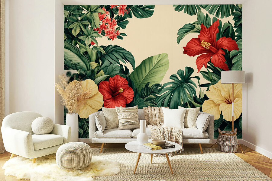 Transformați orice cameră într-un refugiu tropical cu acest tapet uimitor, care prezintă un grup vibrant de flori și frunze luxuriante. Imaginați-vă că intrați în spațiul dvs. și sunteți întâmpinați de flori de hibiscus îndrăznețe și verdeață intensă. Este ca o mini-vacanță chiar la tine acasă! Acest fototapet nu numai că adaugă culoare, ci și un spirit plin de viață, perfect pentru a înveseli sufrageria sau pentru a invita un strop de natură într-un colț confortabil de lectură. Imaginează-ți cum savurezi o băutură în timp ce te bucuri de această frumusețe botanică – fericire pură! Perfect pentru oricine dorește un strop de farmec al naturii fără a fi nevoit să ude nimic.