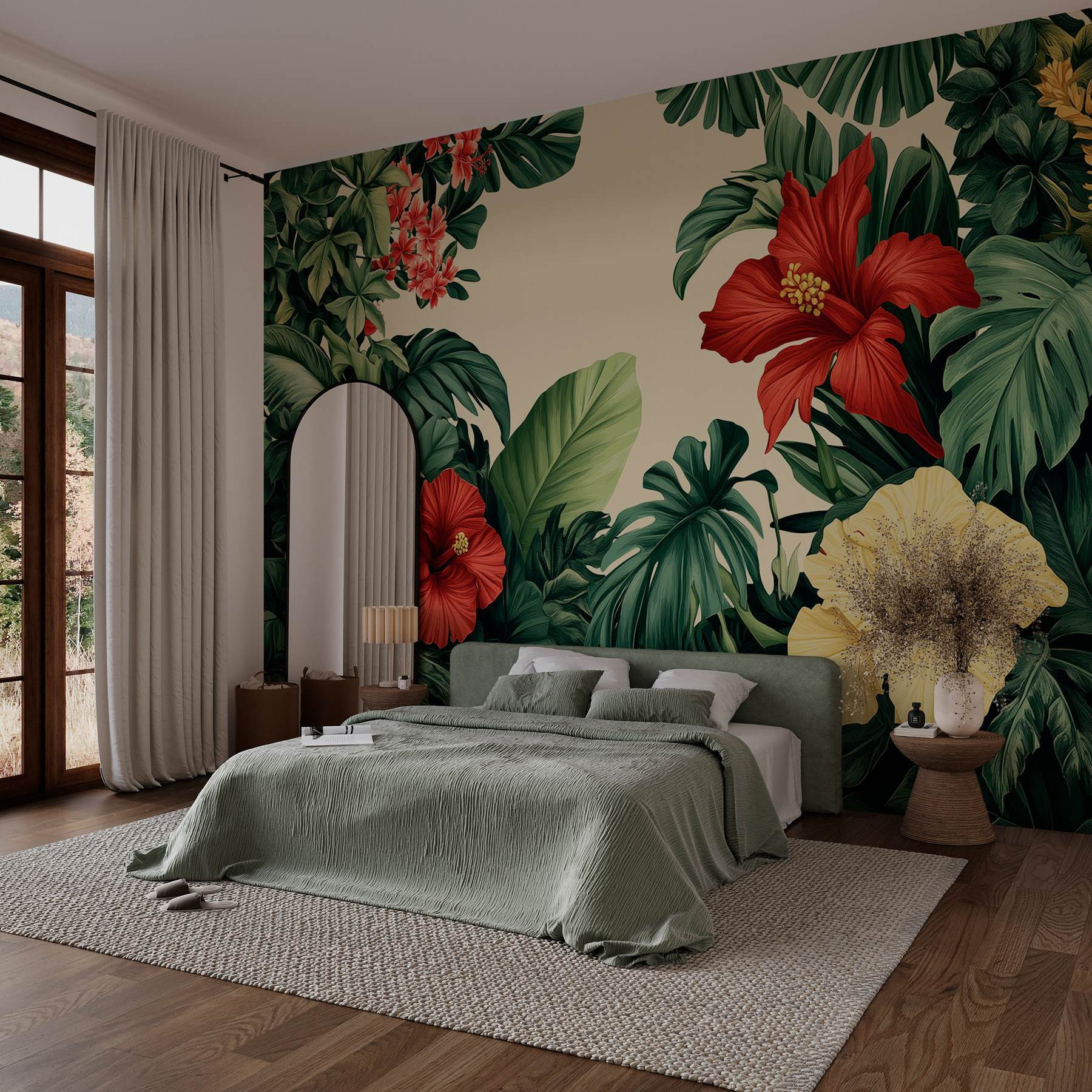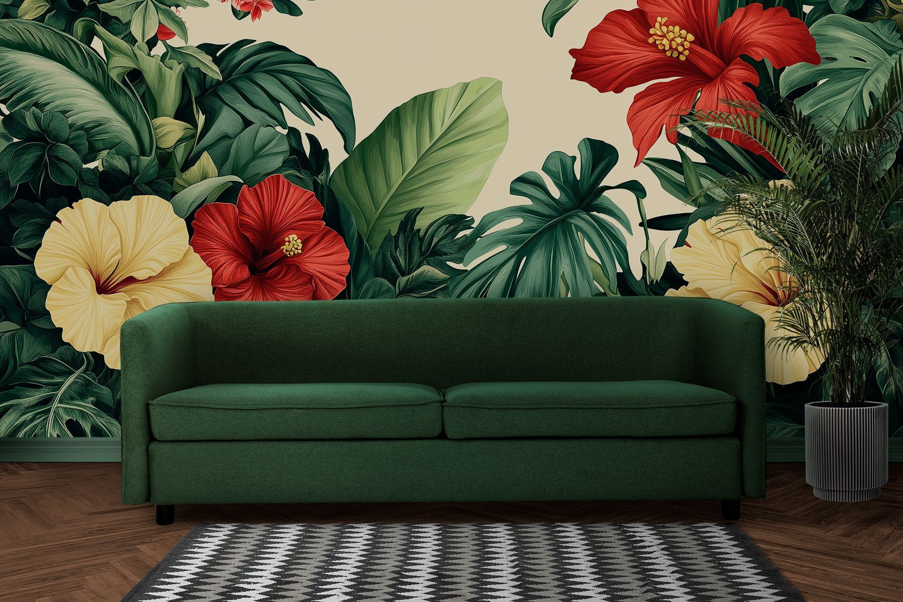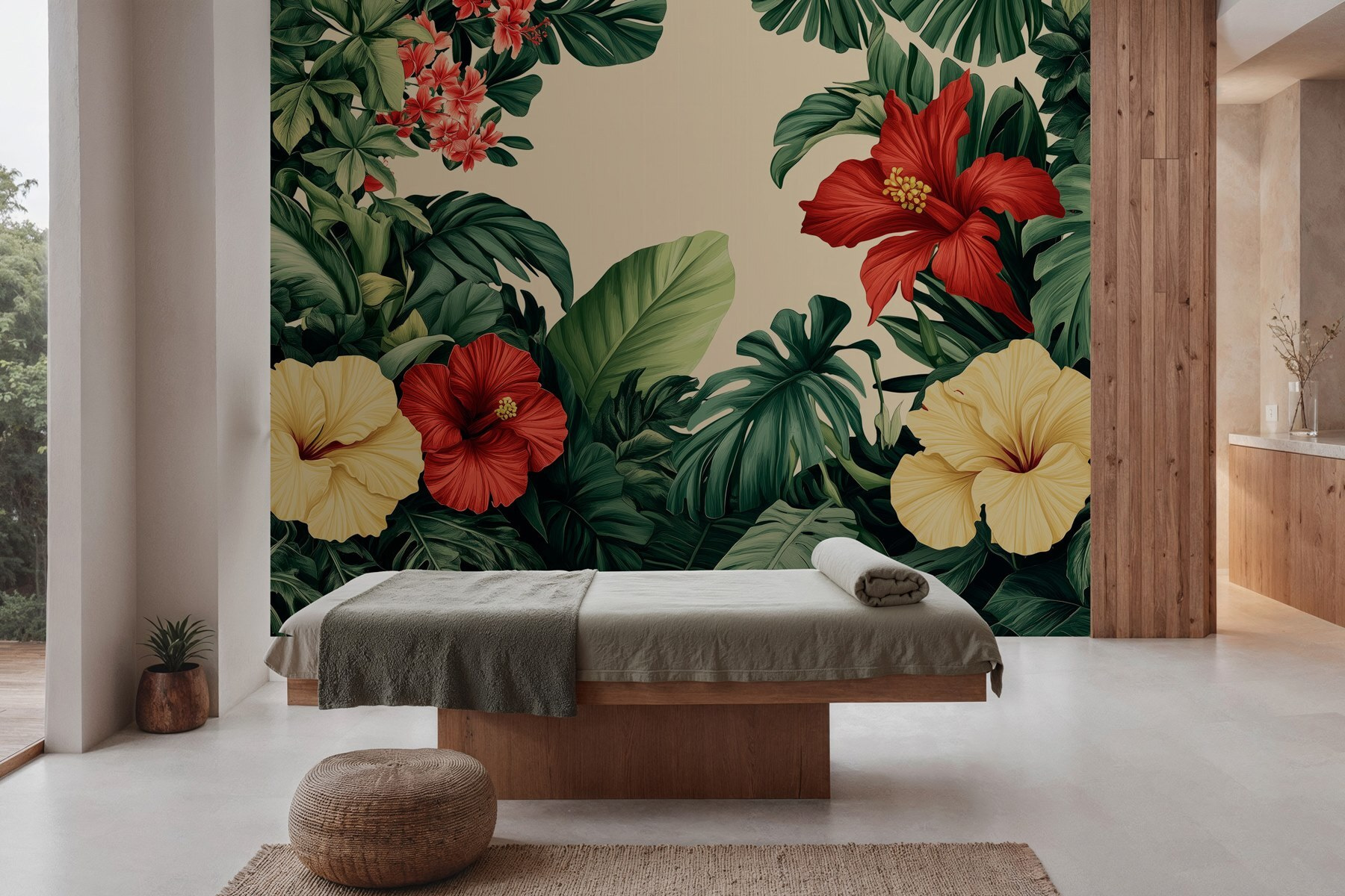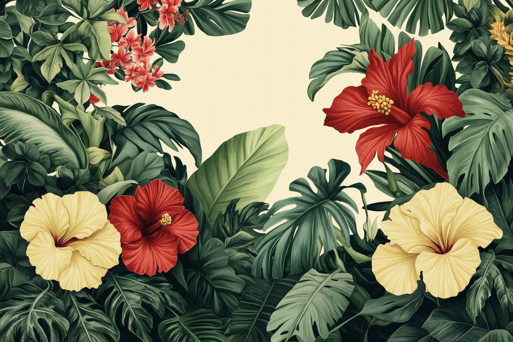 Transformați orice cameră într-un refugiu tropical cu acest tapet uimitor, care prezintă un grup vibrant de flori și frunze luxuriante. Imaginați-vă că intrați în spațiul dvs. și sunteți întâmpinați de flori de hibiscus îndrăznețe și verdeață intensă. Este ca o mini-vacanță chiar la tine acasă! Acest fototapet nu numai că adaugă culoare, ci și un spirit plin de viață, perfect pentru a înveseli sufrageria sau pentru a invita un strop de natură într-un colț confortabil de lectură. Imaginează-ți cum savurezi o băutură în timp ce te bucuri de această frumusețe botanică – fericire pură! Perfect pentru oricine dorește un strop de farmec al naturii fără a fi nevoit să ude nimic.